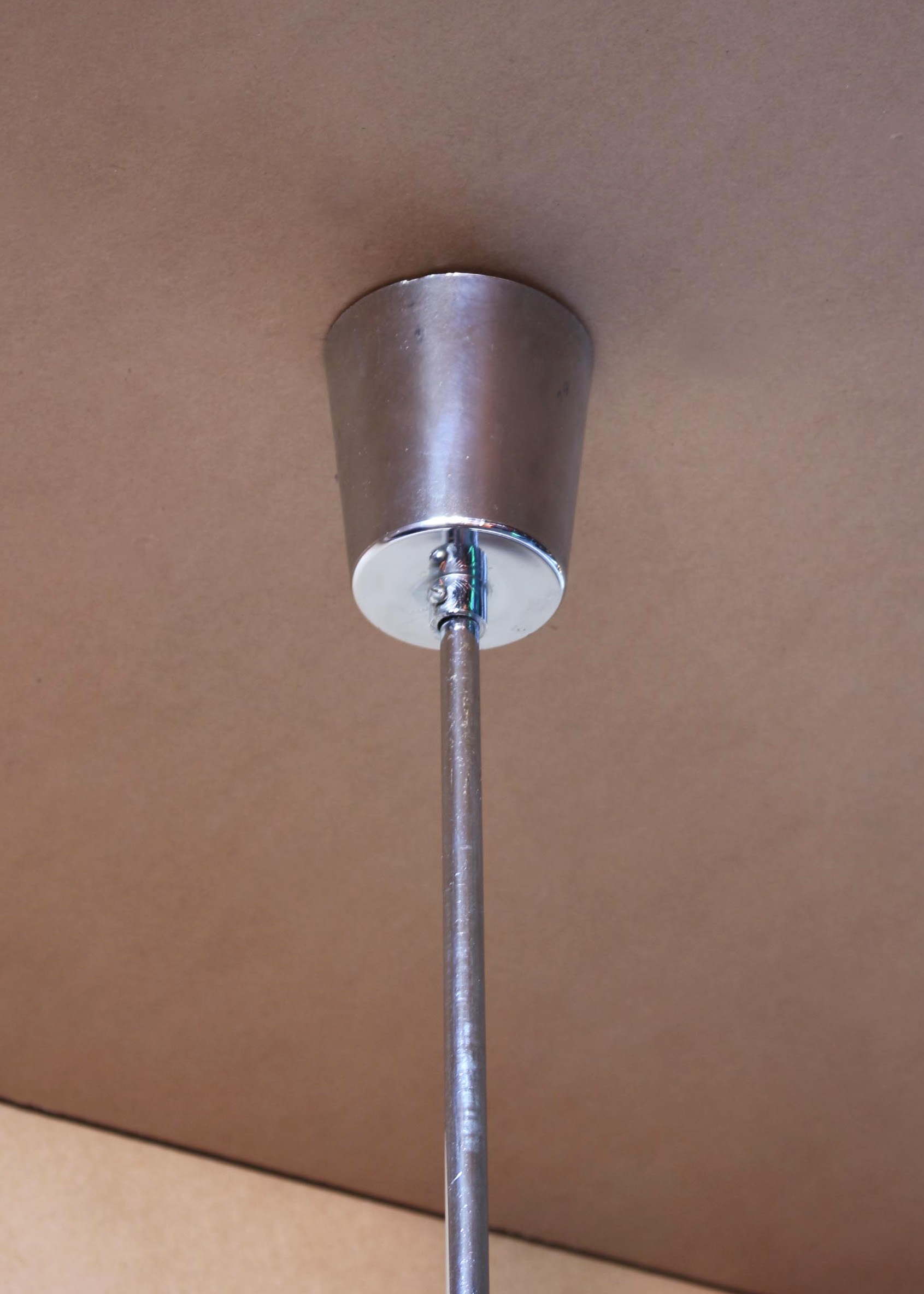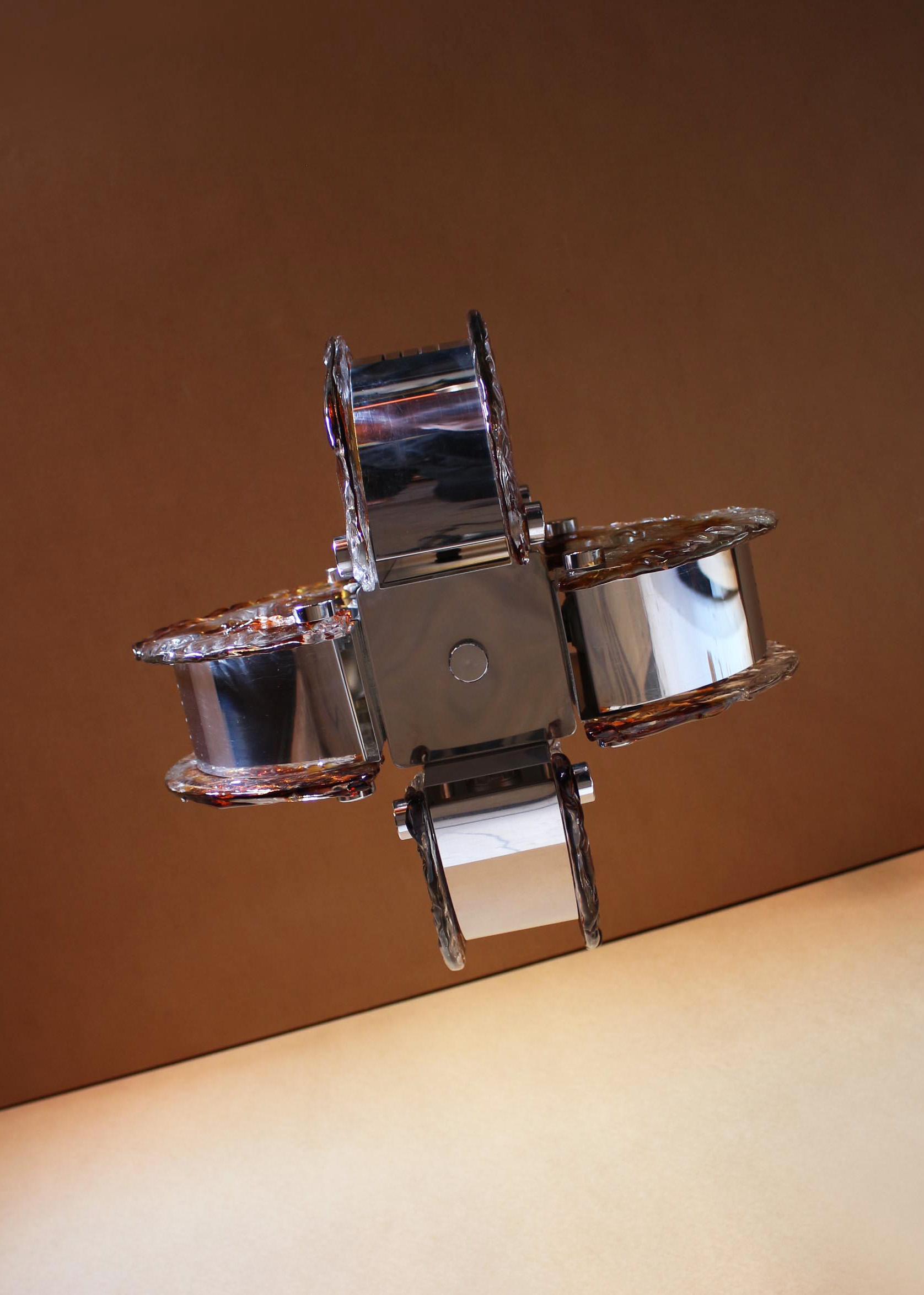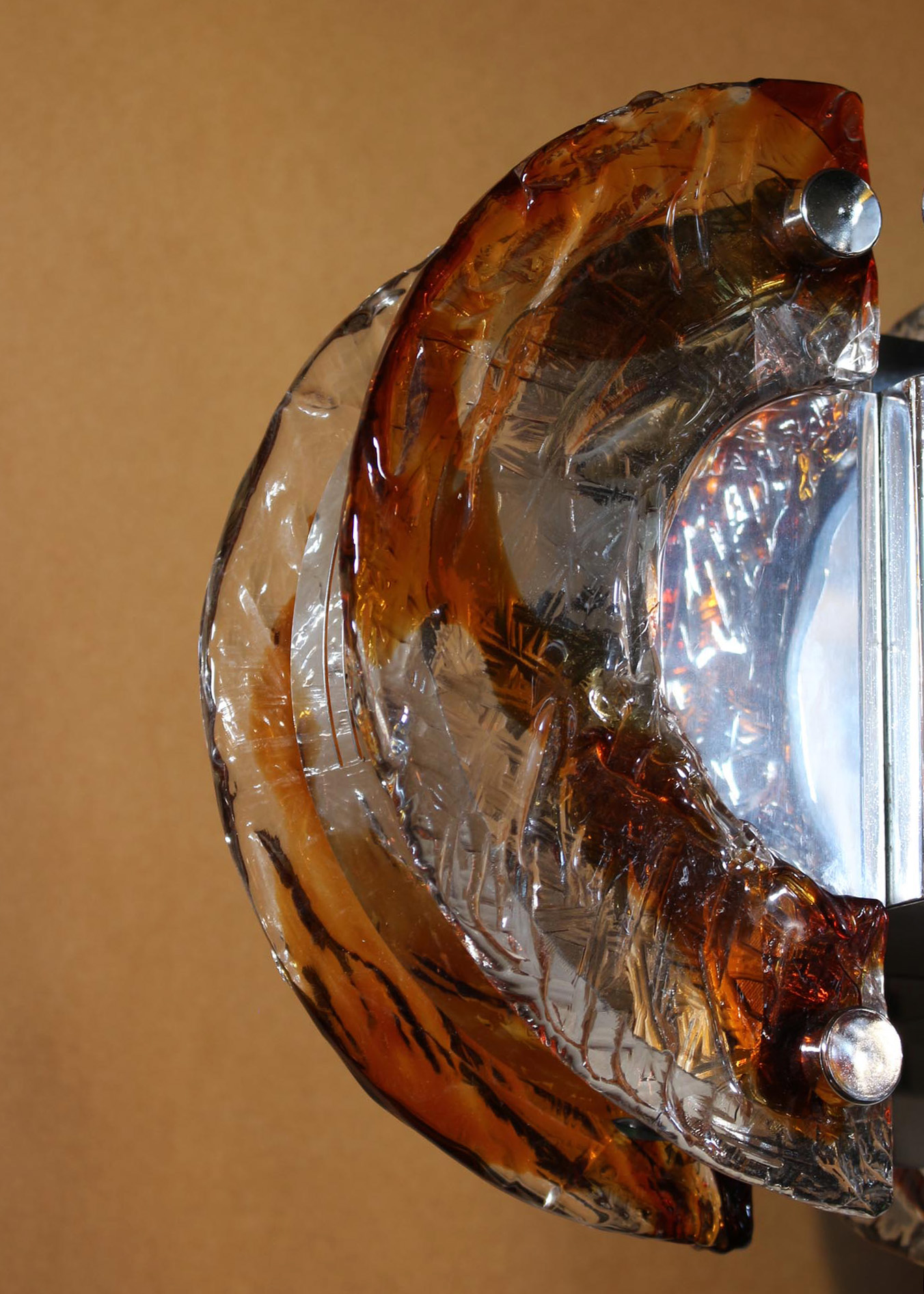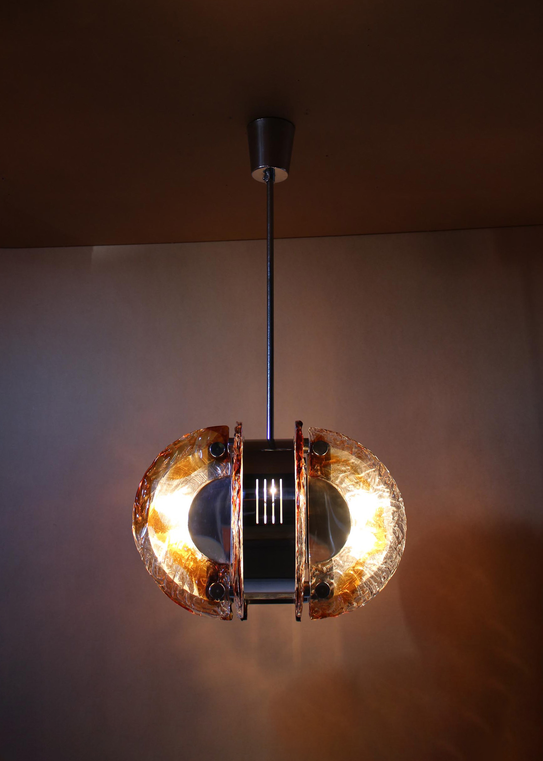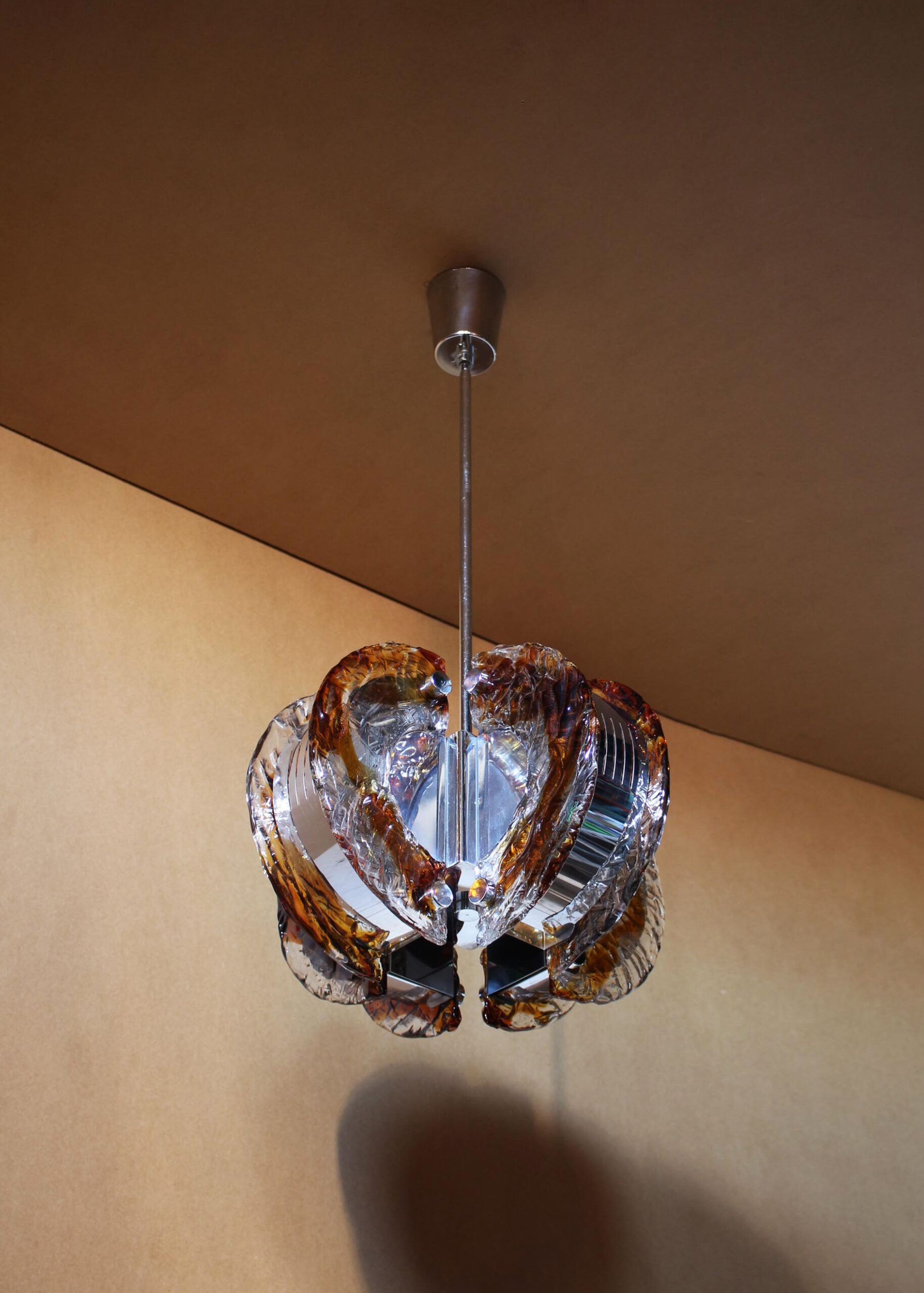A fine 1970s chrome and glass (clear and amber) Murano pendant.