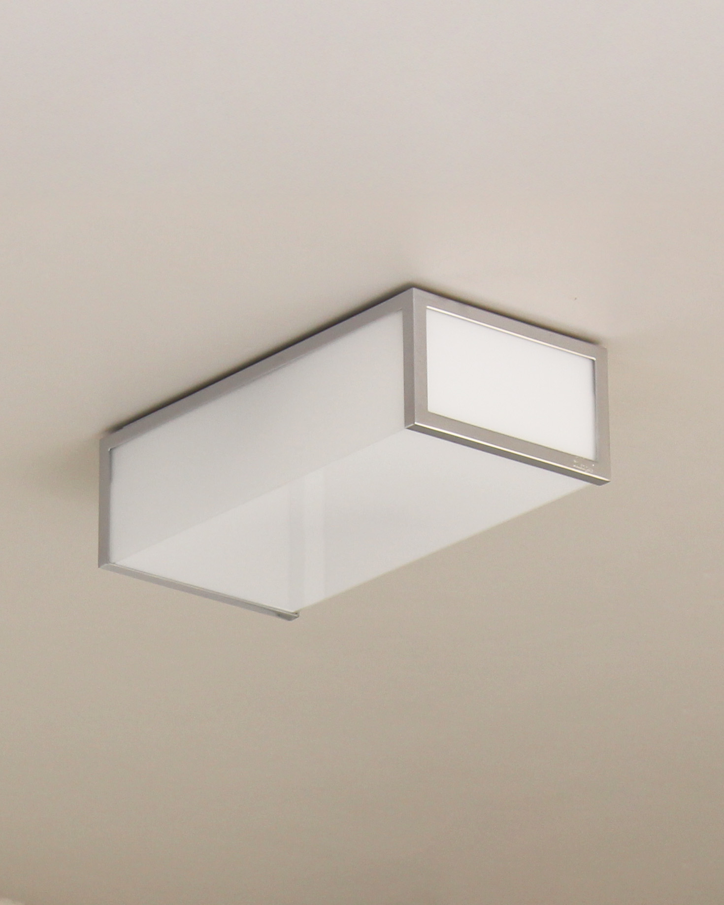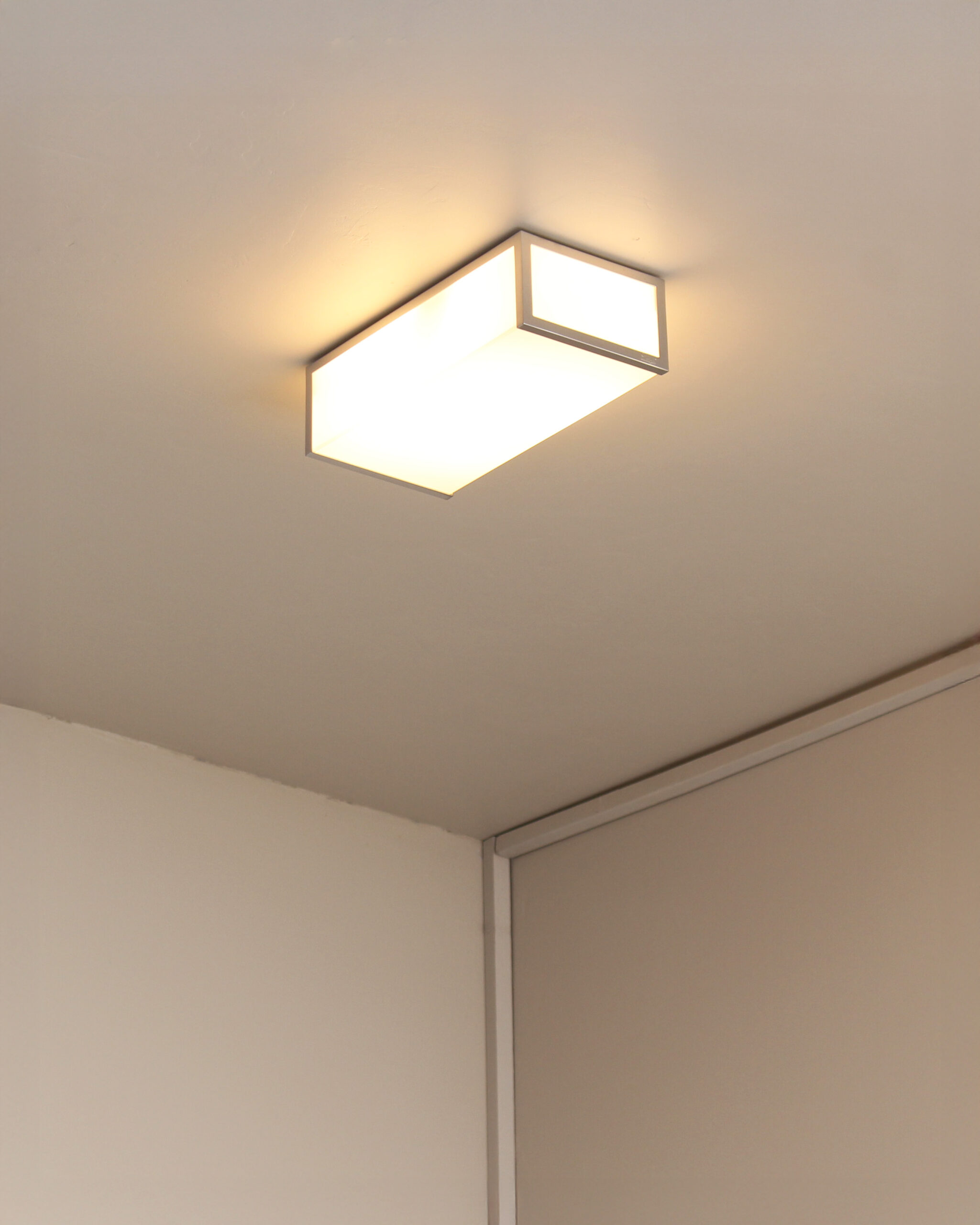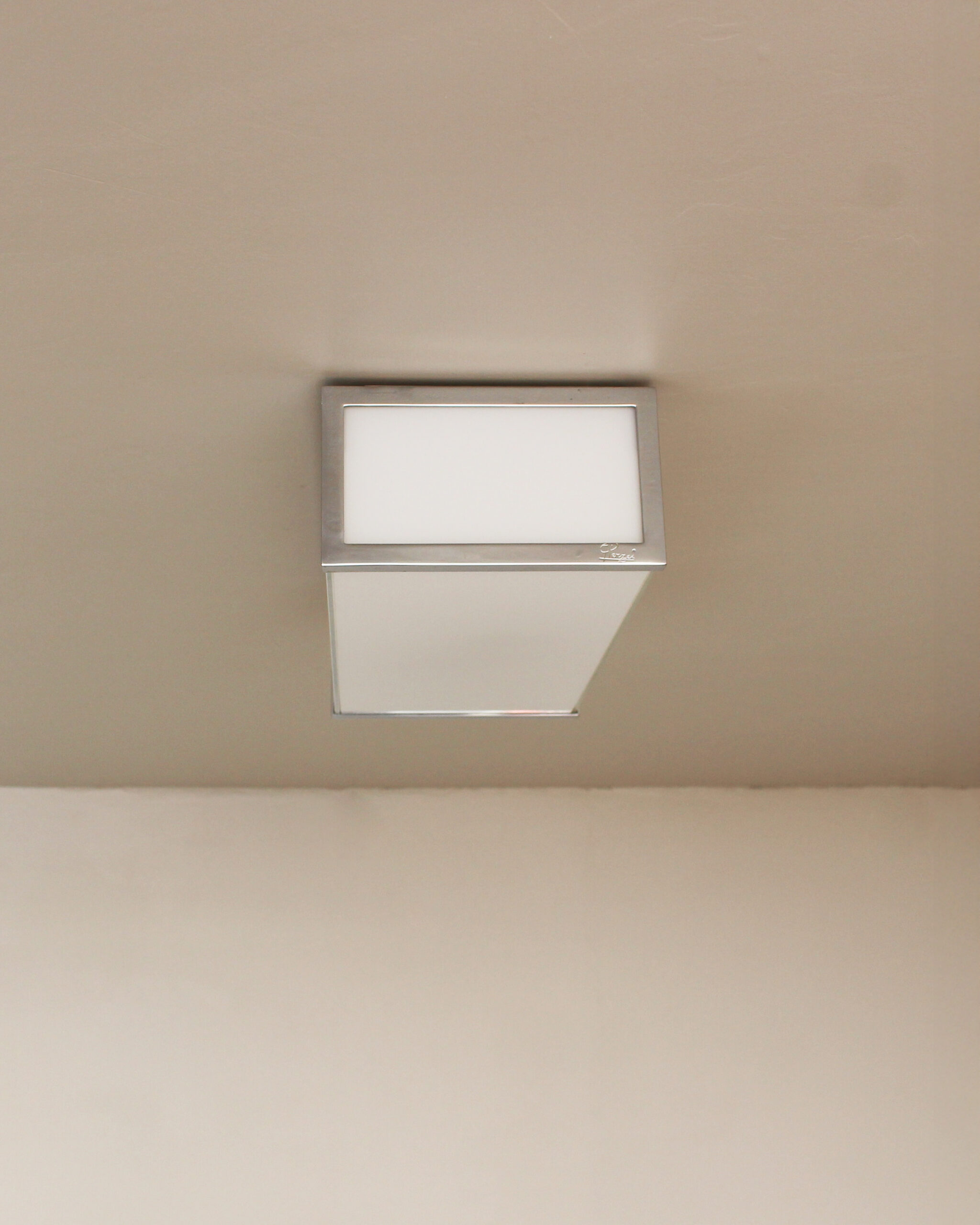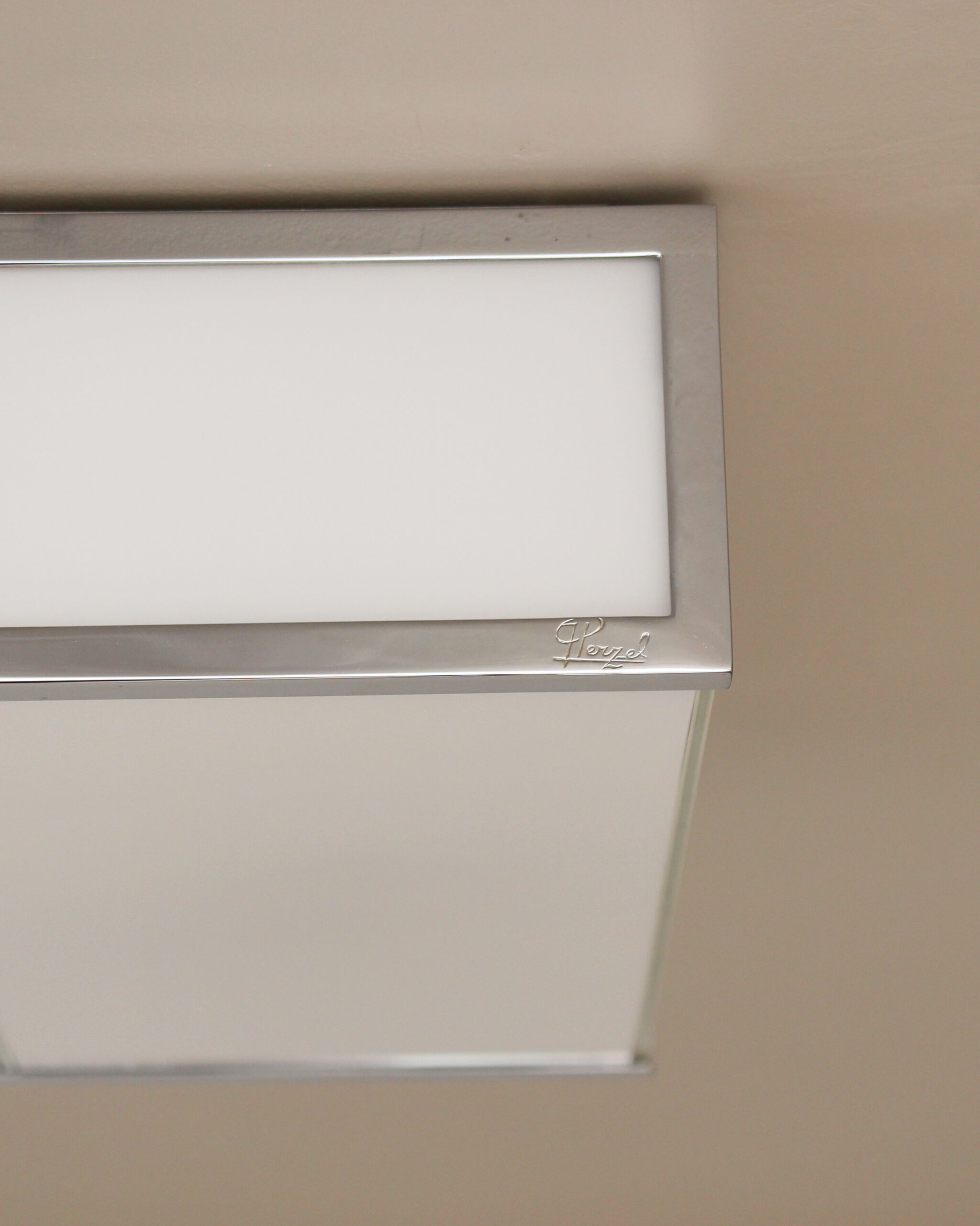 Atelier Jean Perzel – Seven small fine French Art Deco rectangular chrome and white enameled glass ceiling lights. Price is per fixture. Signed.