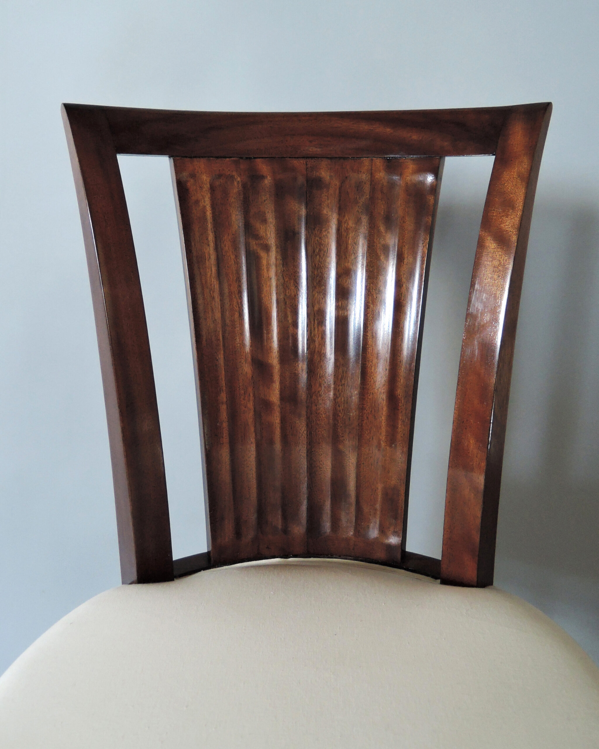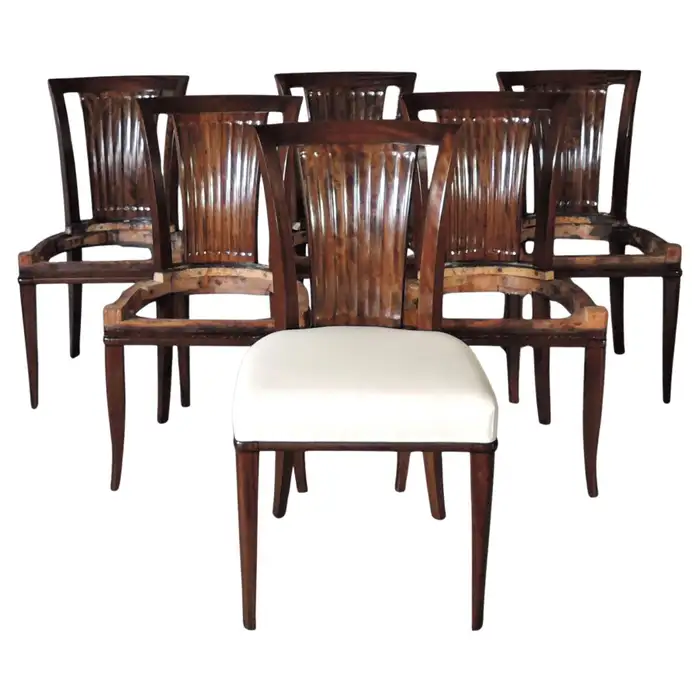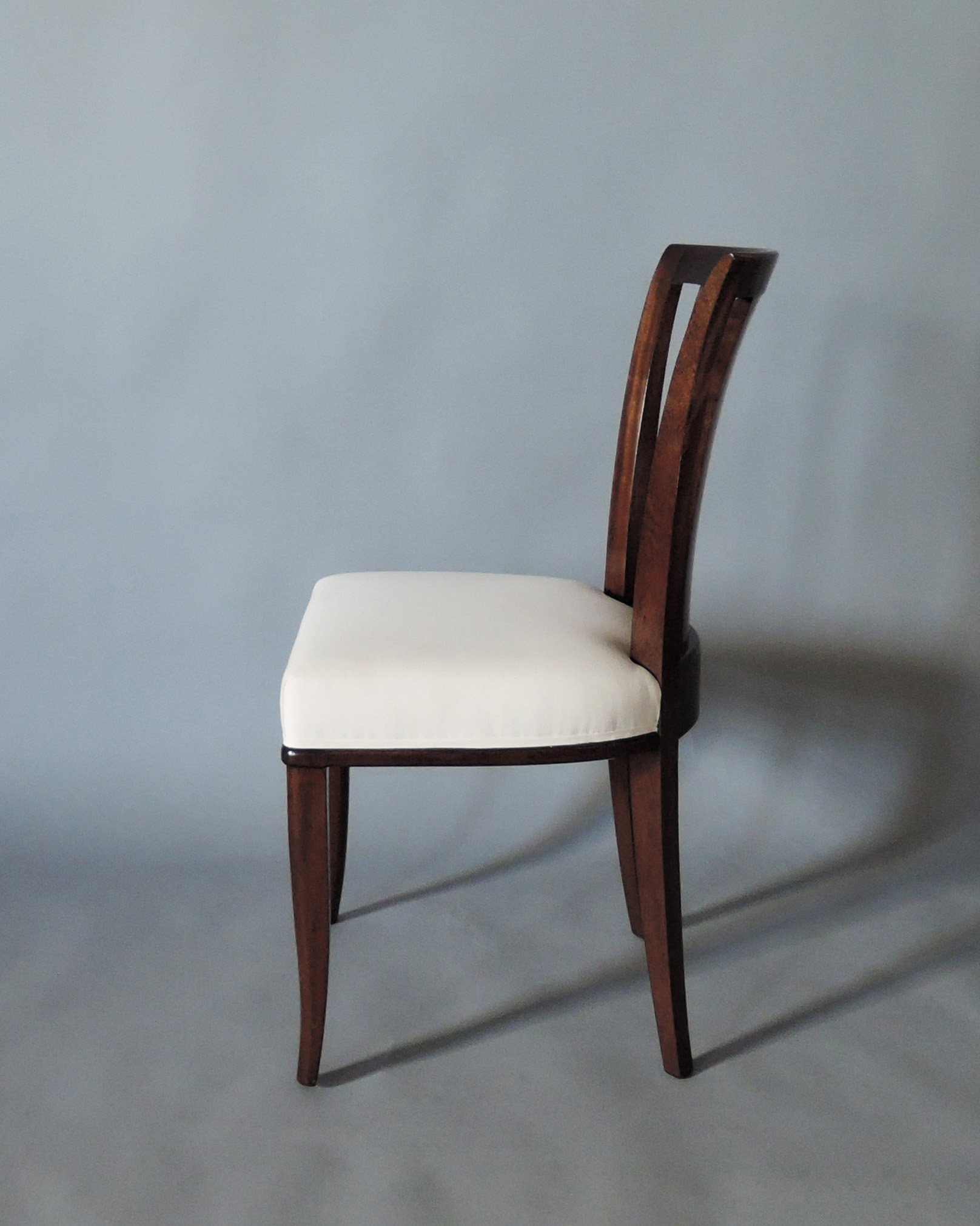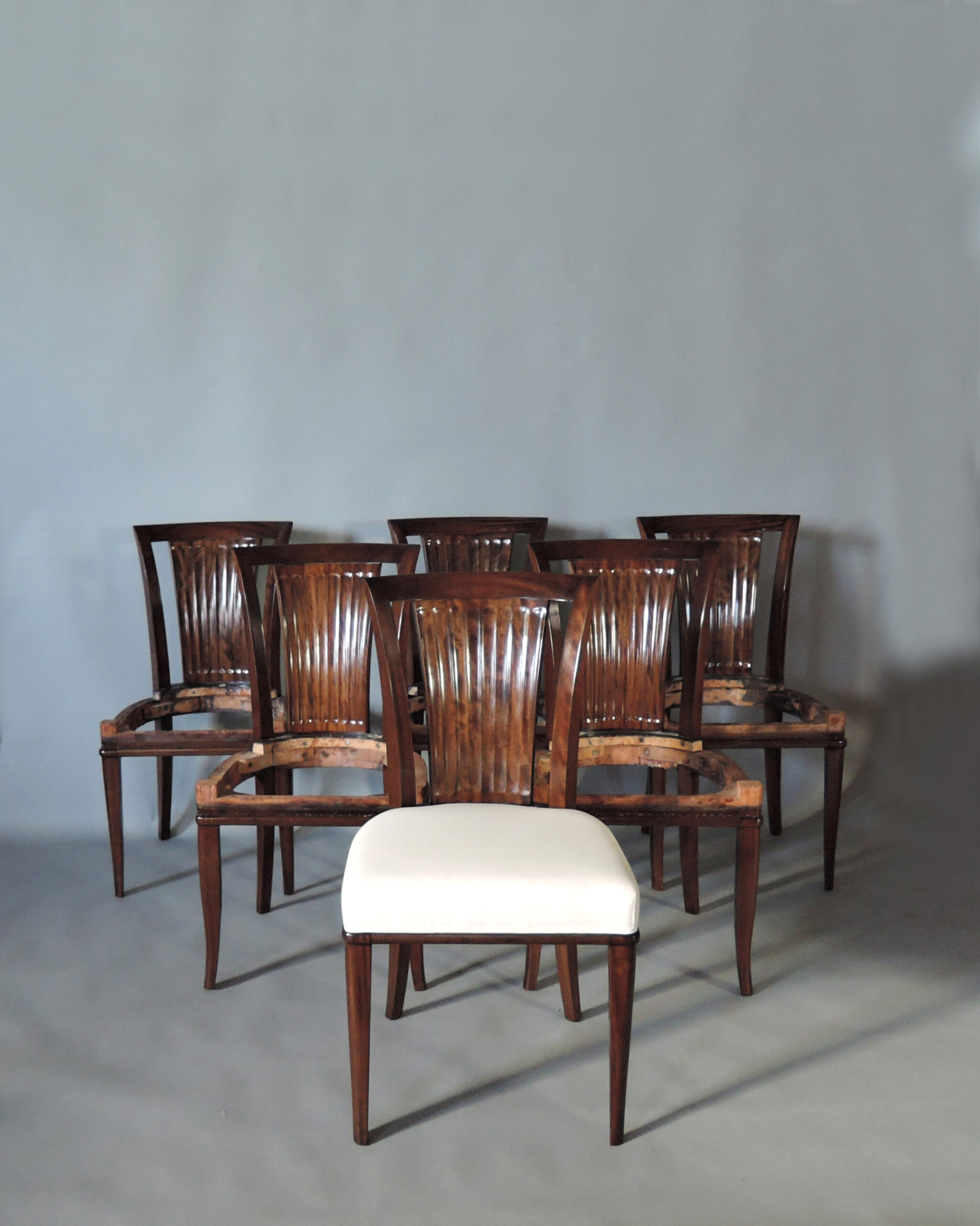 A set of six fine French Art Deco dining chairs in solid mahogany by Gaston Poisson.