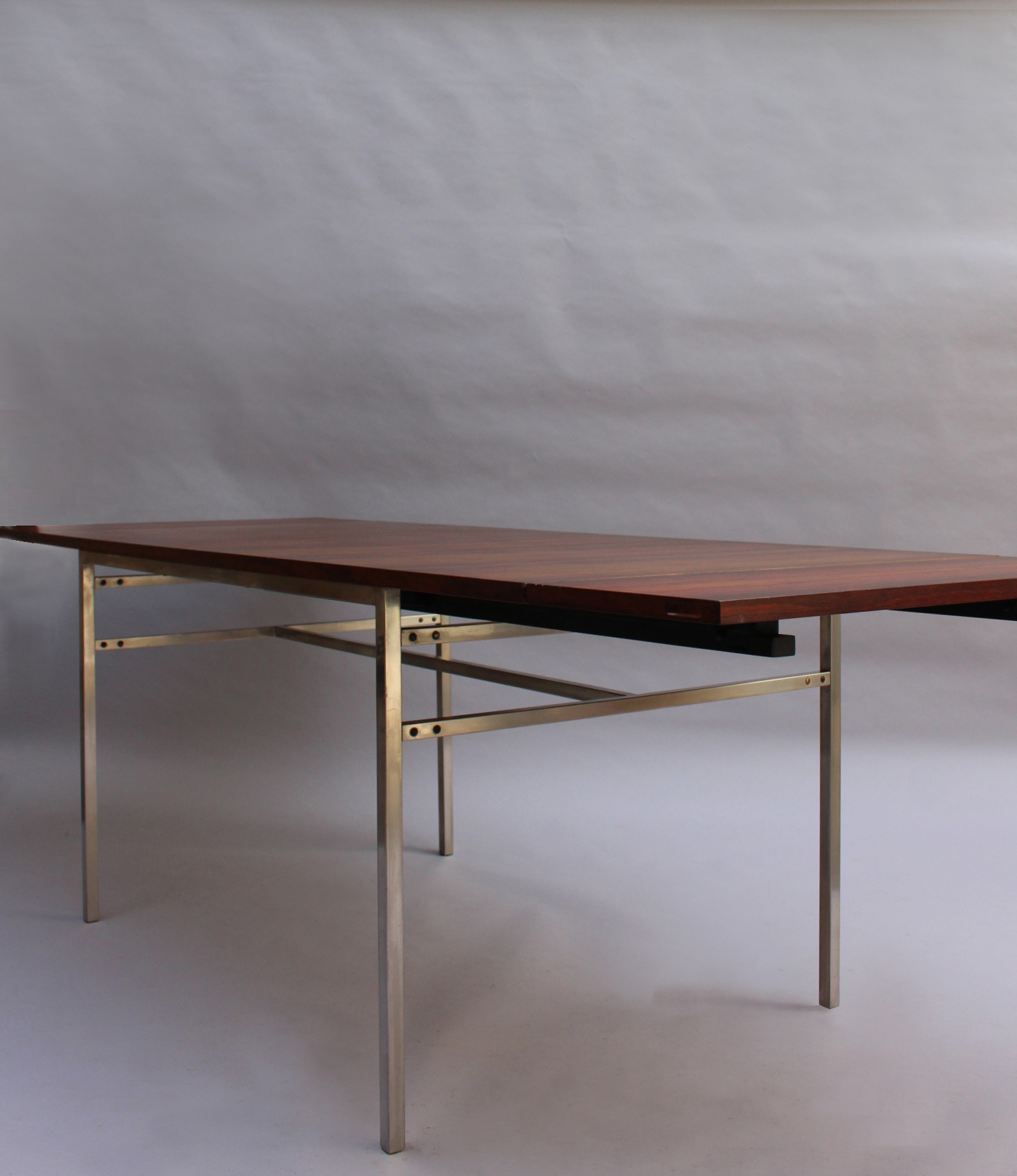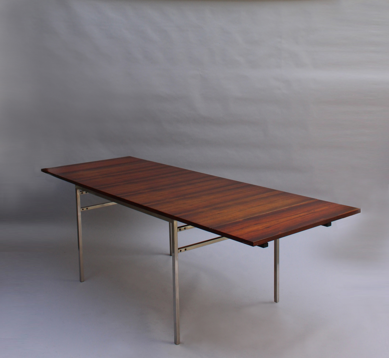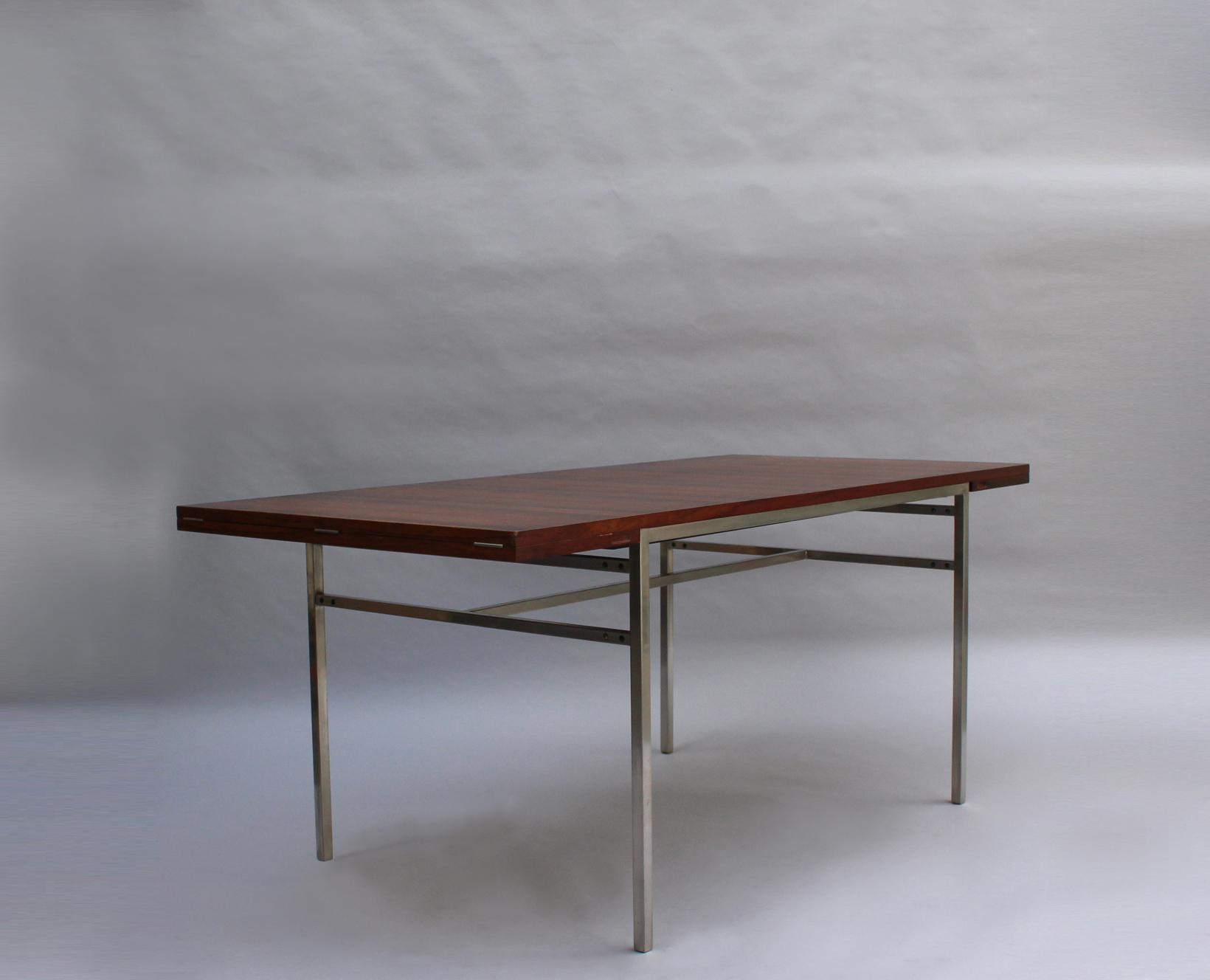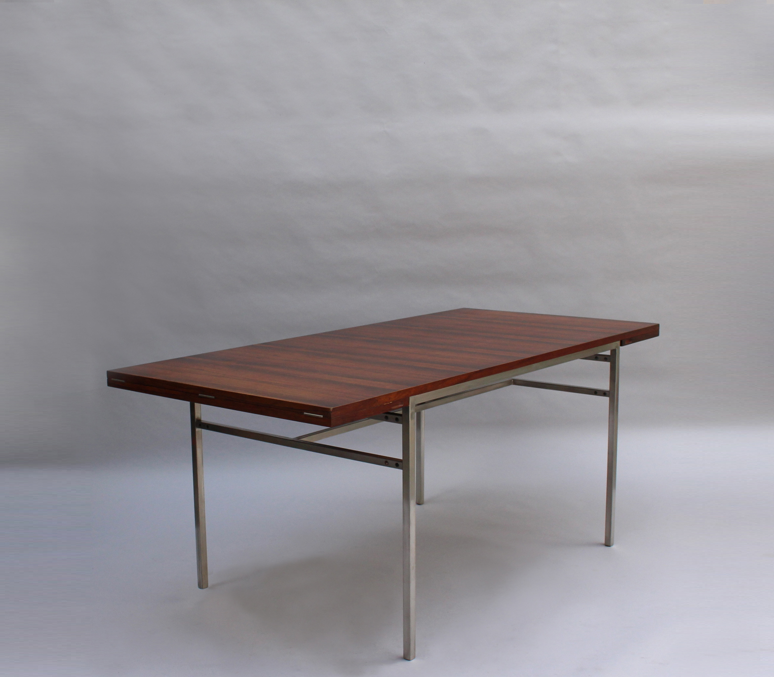 A fine French mid-century rectangular dining table with a chromed metal base, veneered rosewood top and 2 foldout matching end leaves (length with extensions is 94.5 inches).