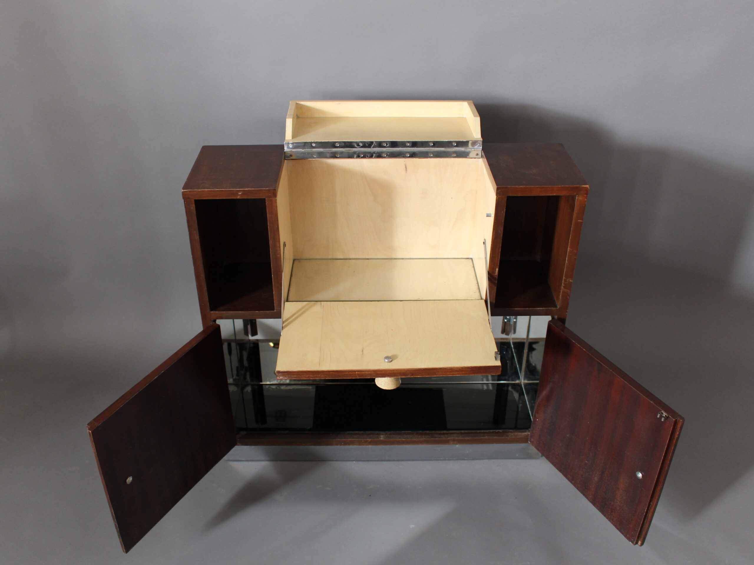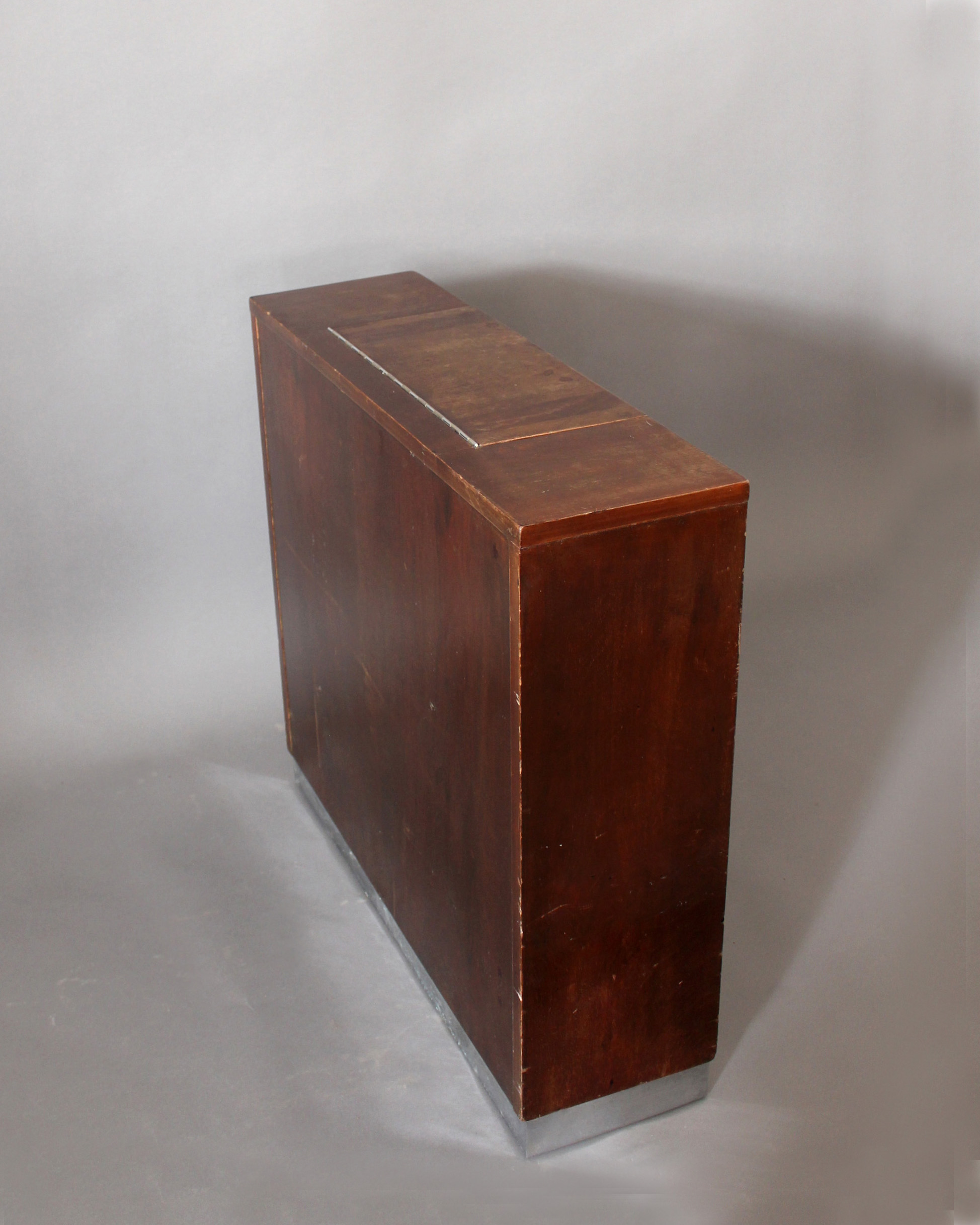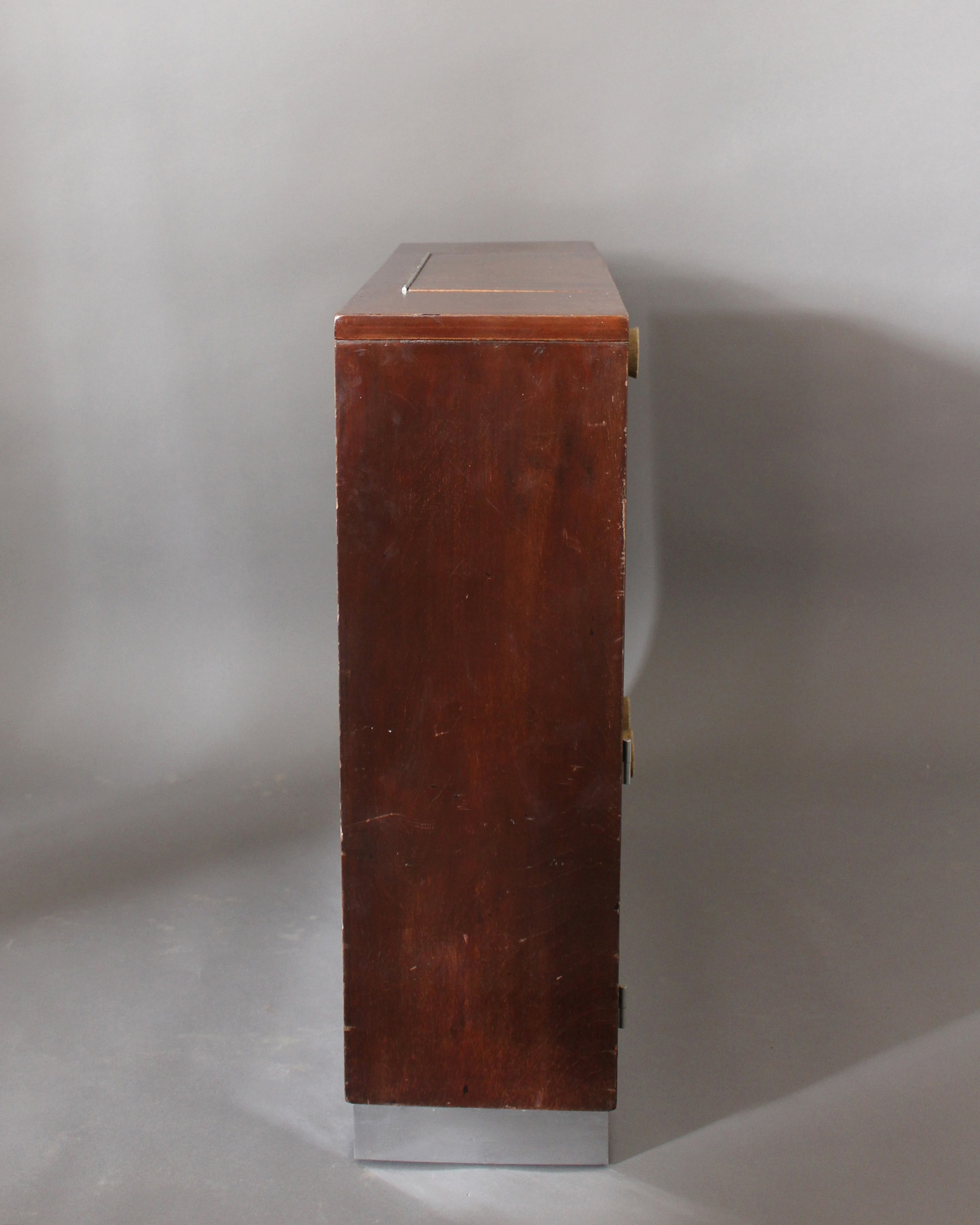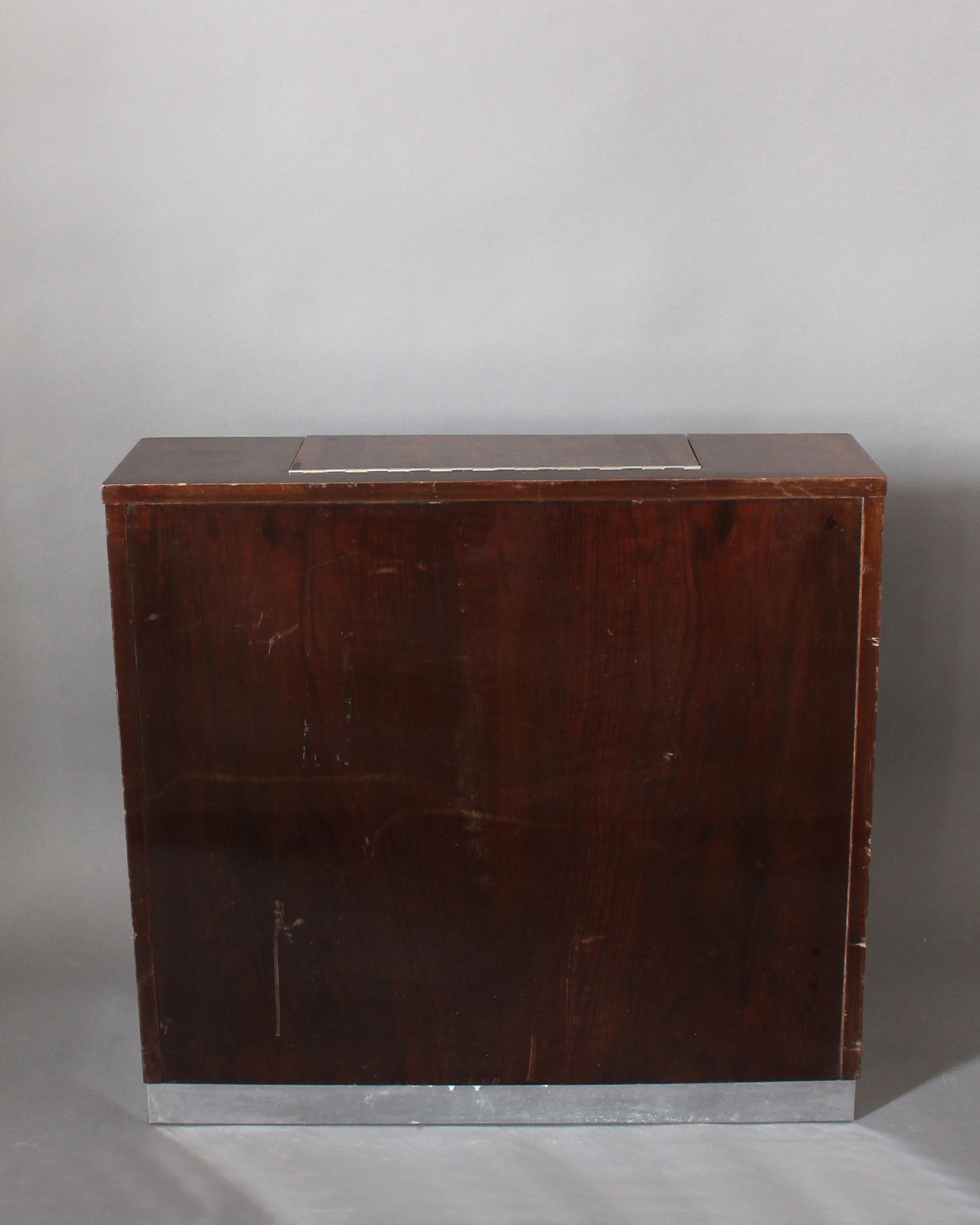 In walnut, with two niches, two bottom doors that open on an mirrored interior and one top up and down front door that opens on a sycamore interior, three original shagreen covered knobs and a stainless steel baseboard.