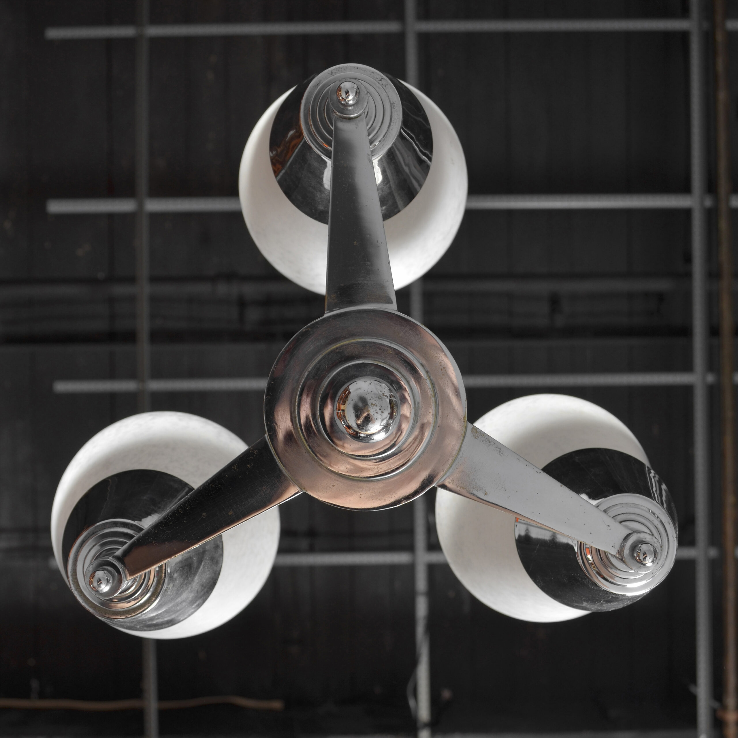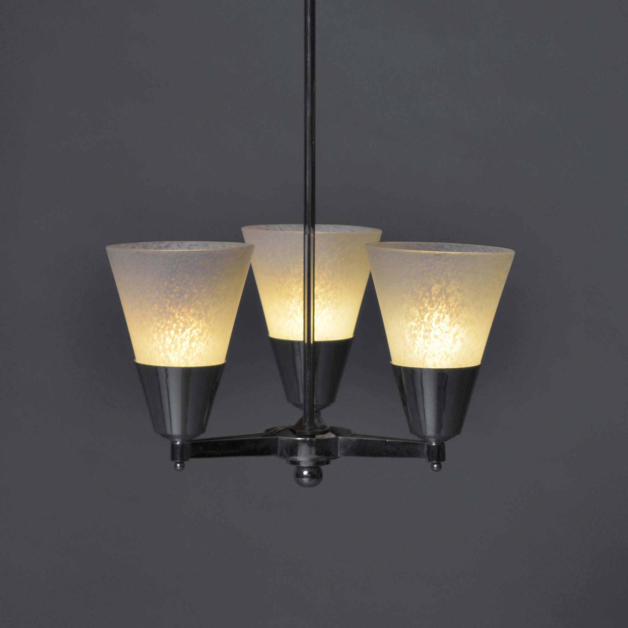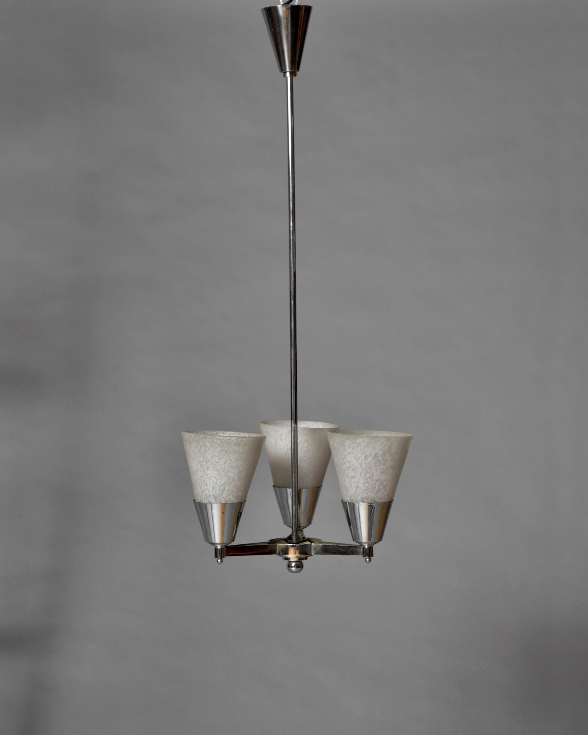 A fine and elegant French Art Deco modernist three arms chandelier with a chrome frame and mottled cameo glass shades.