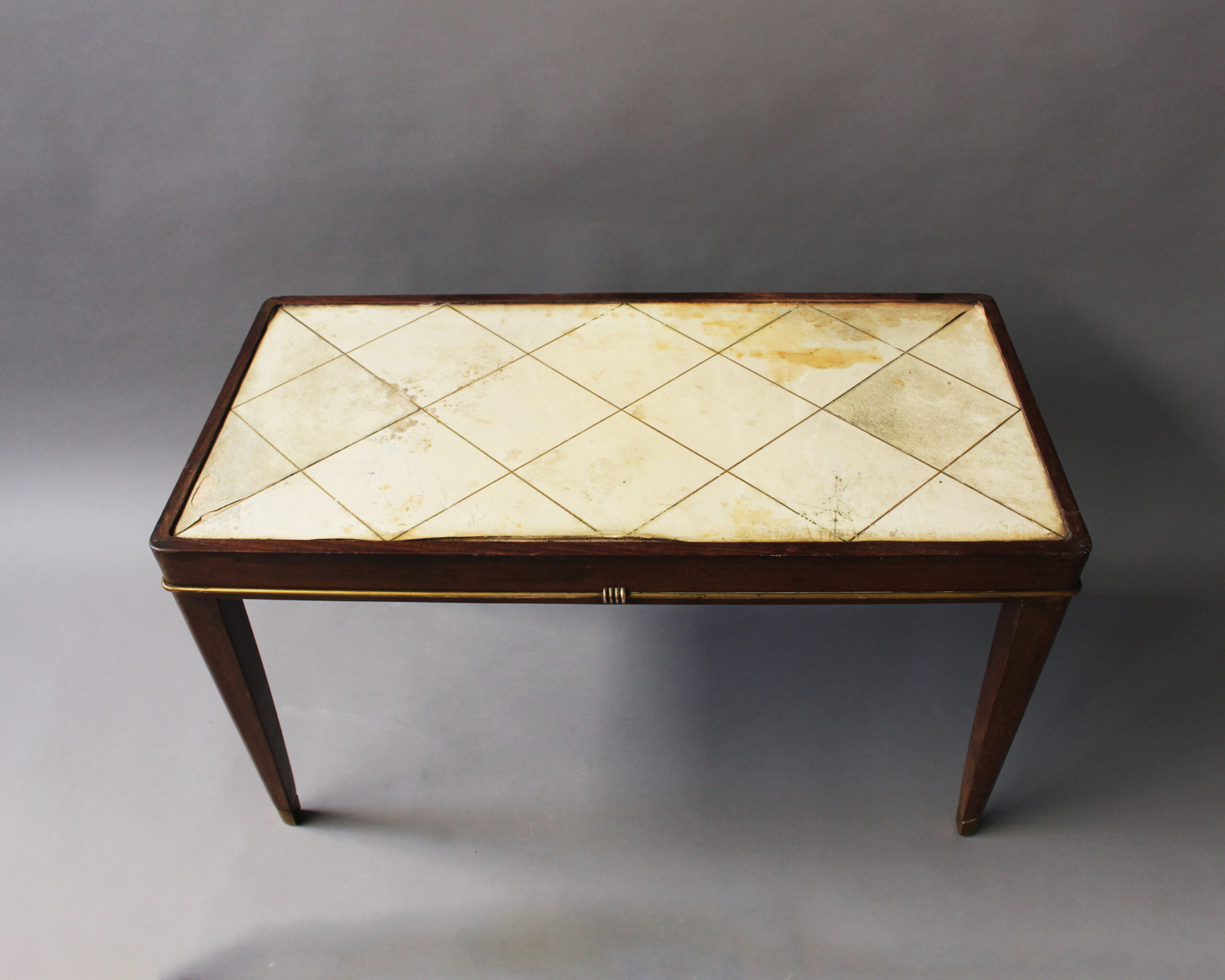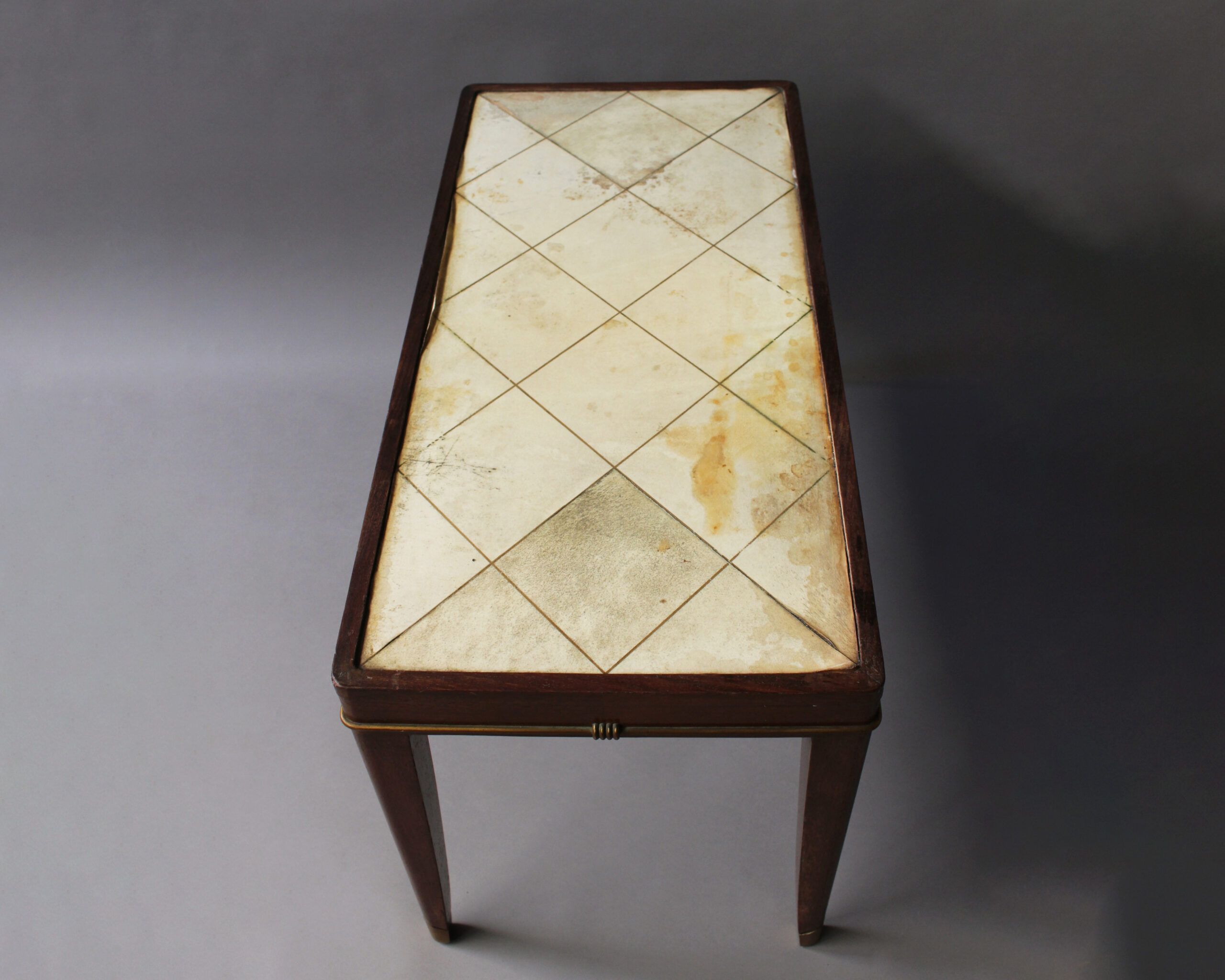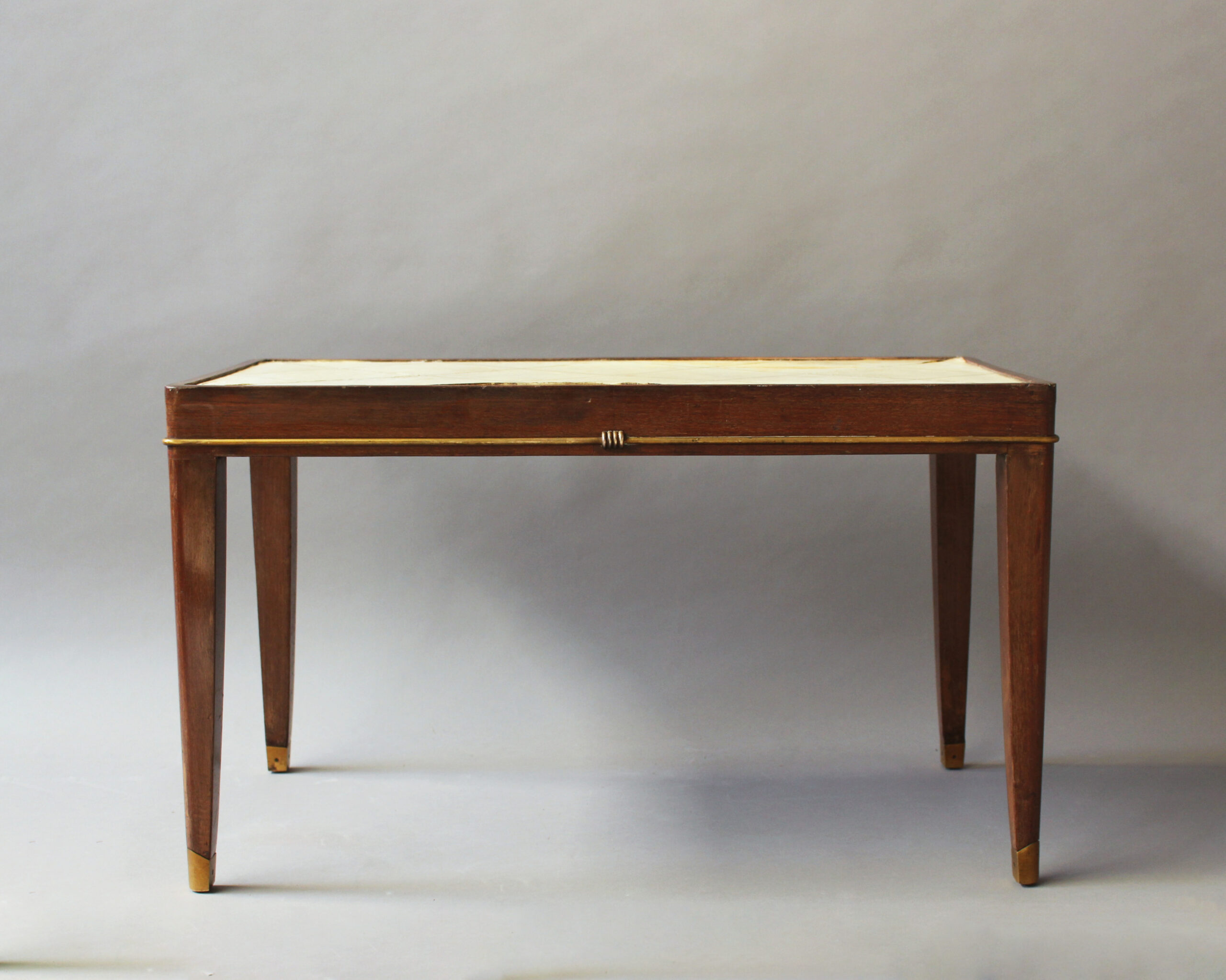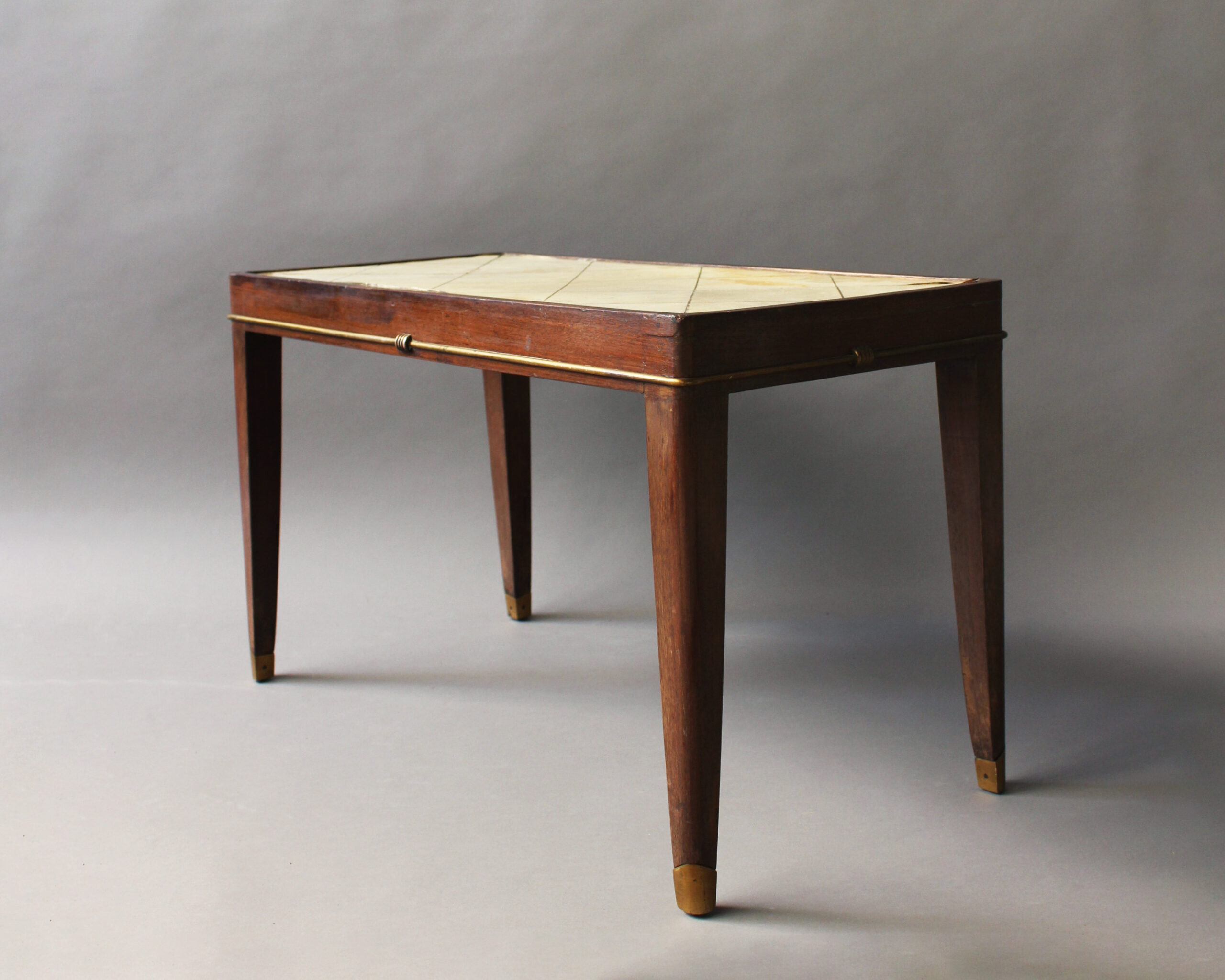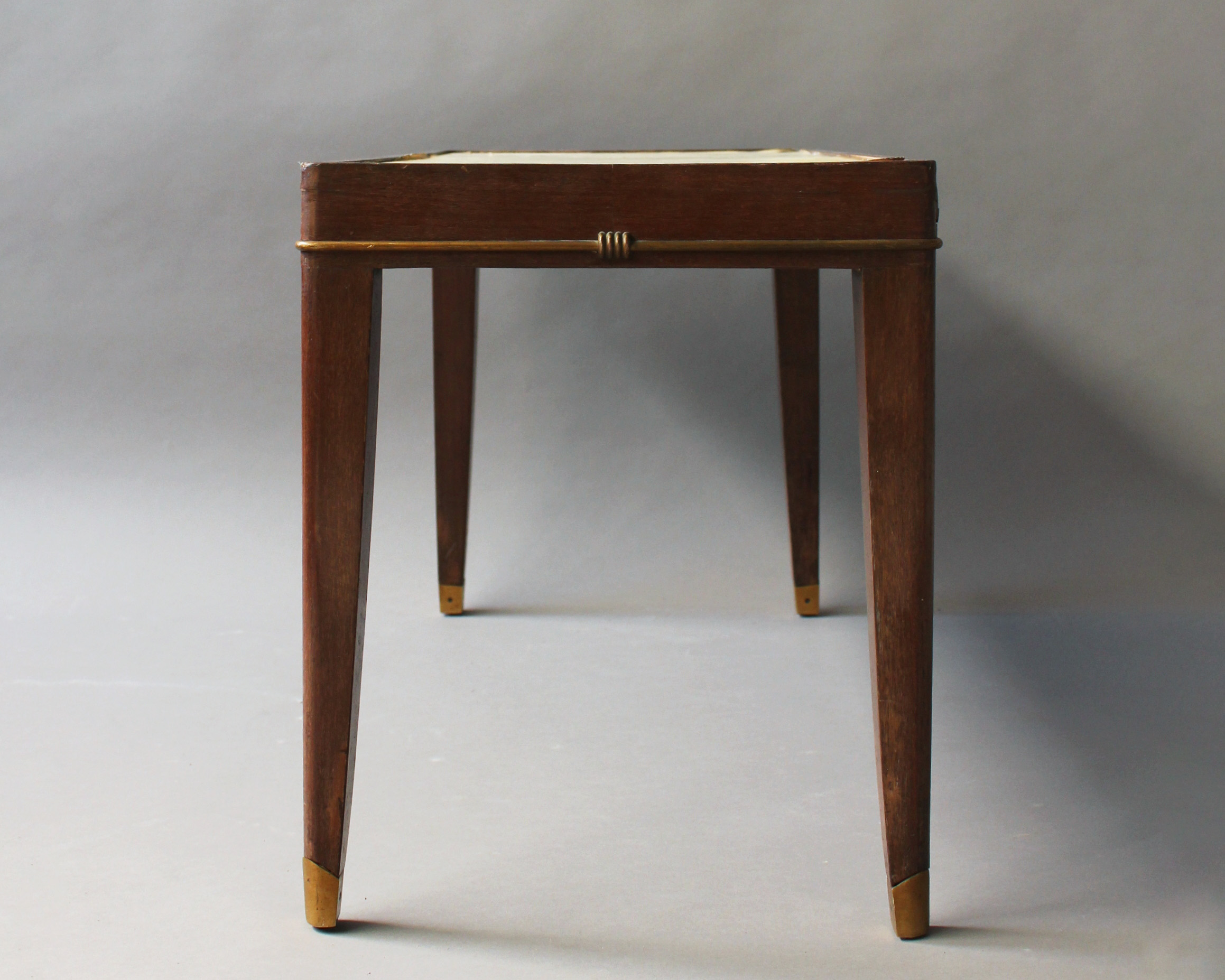 A fine French Art Deco mahogany coffee table with a parchment covered top and bronze details.
