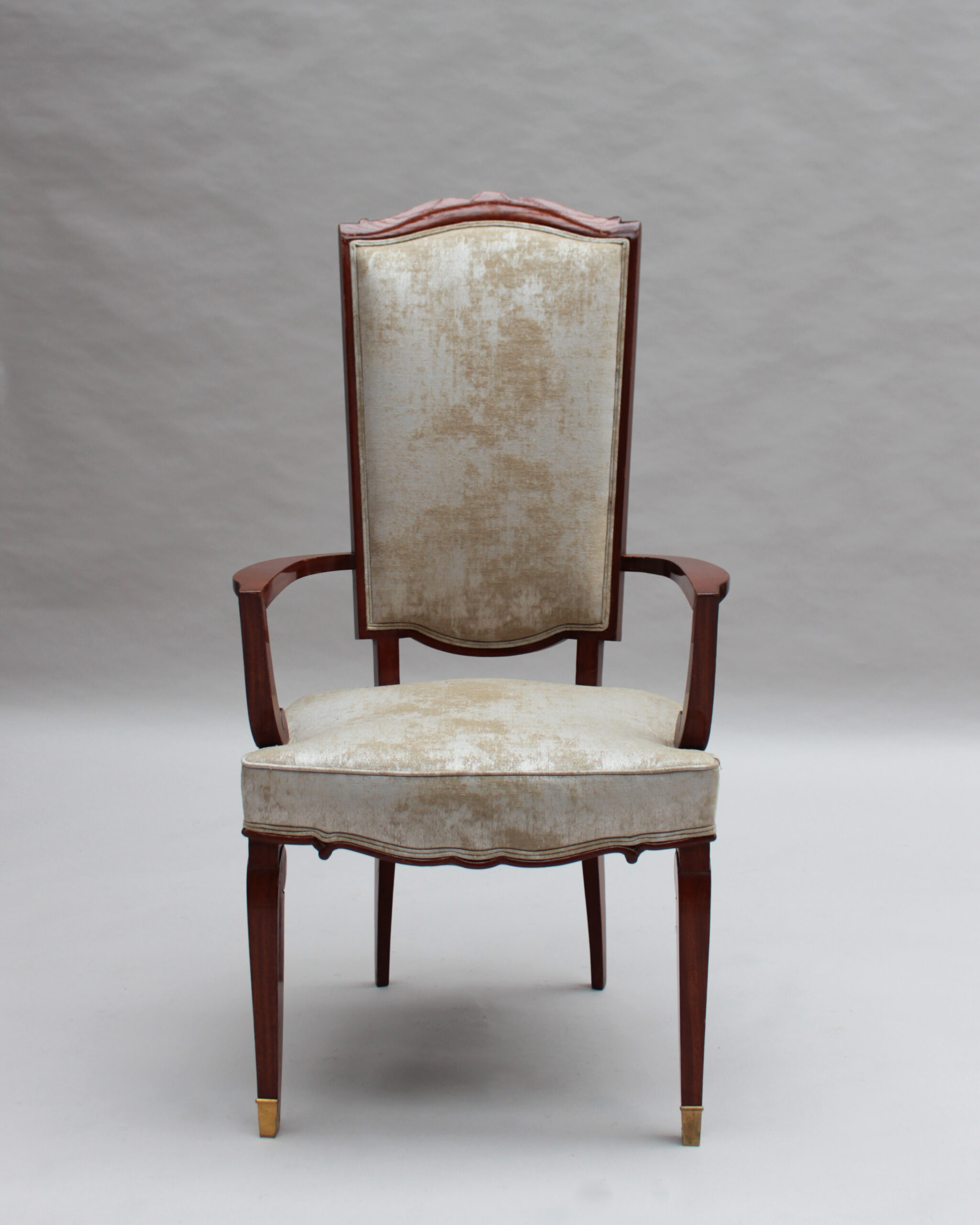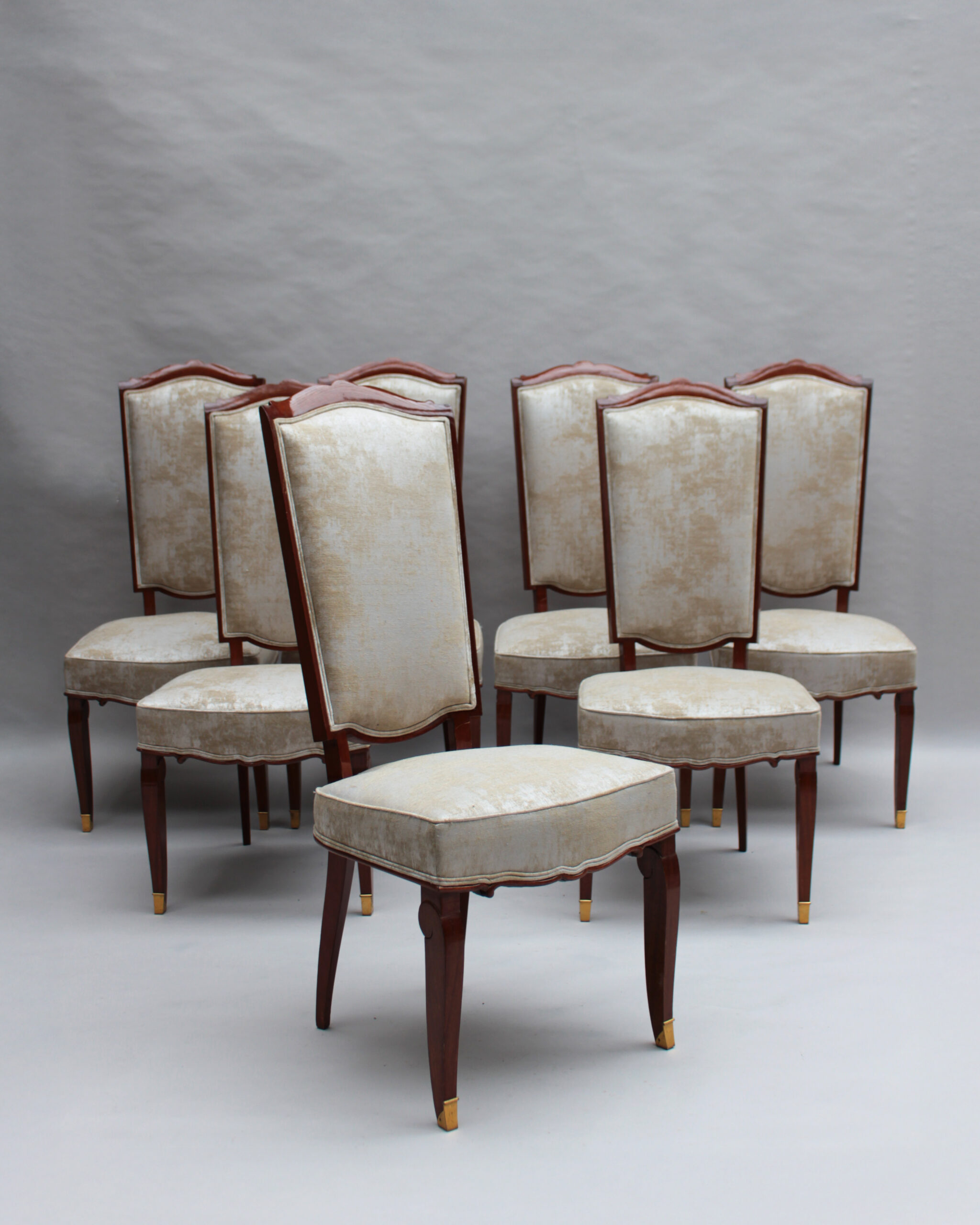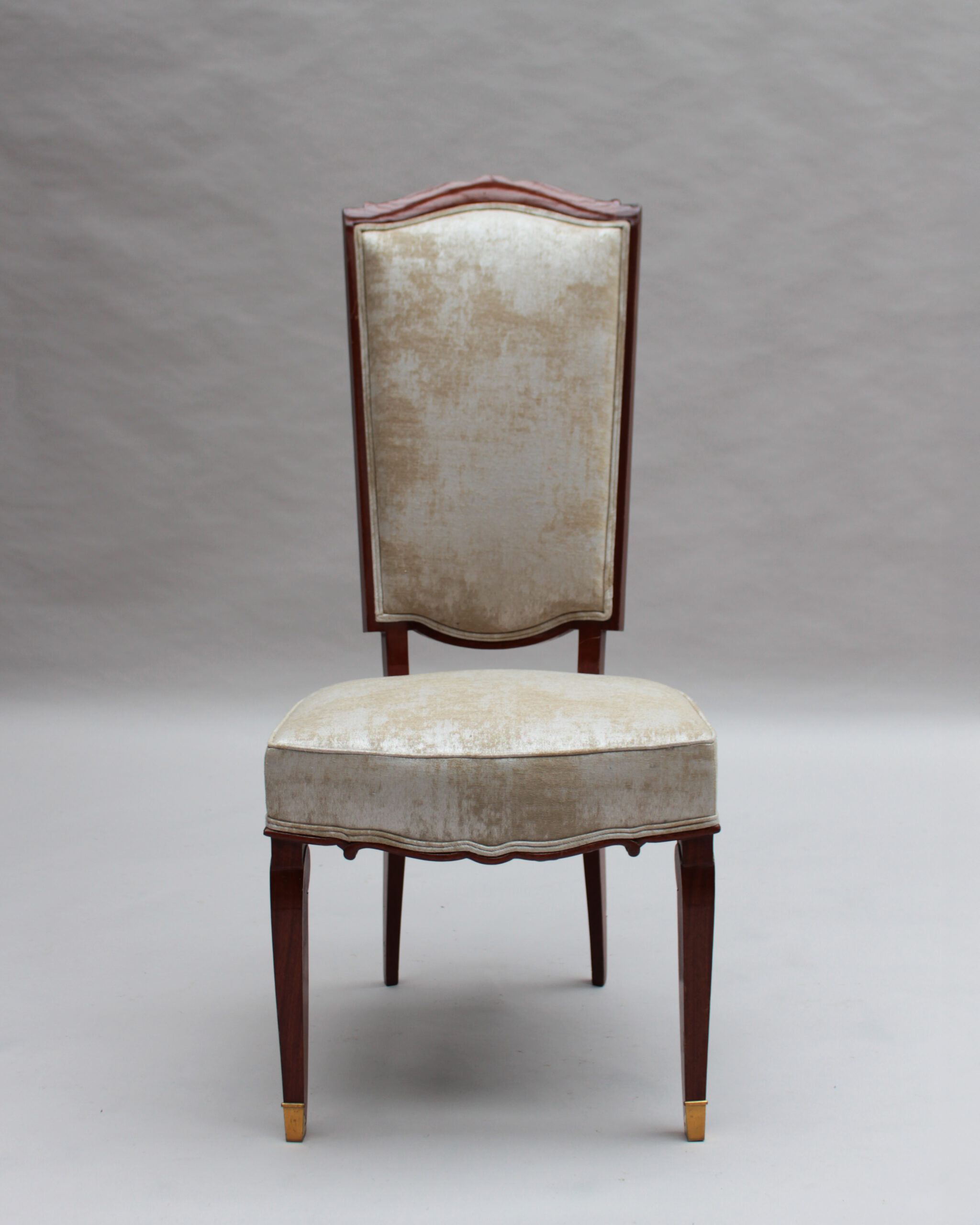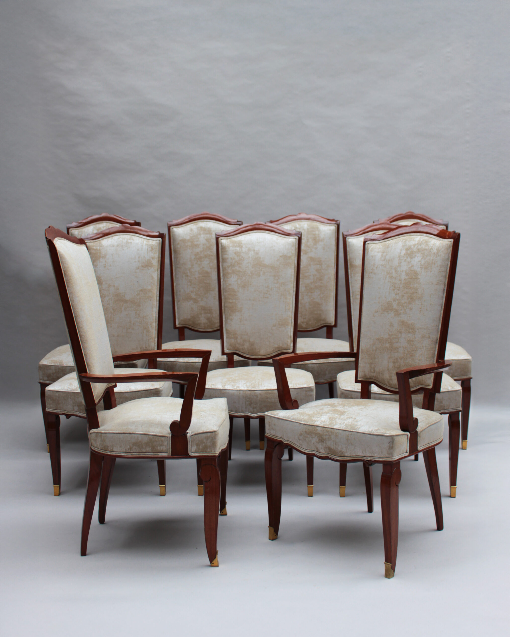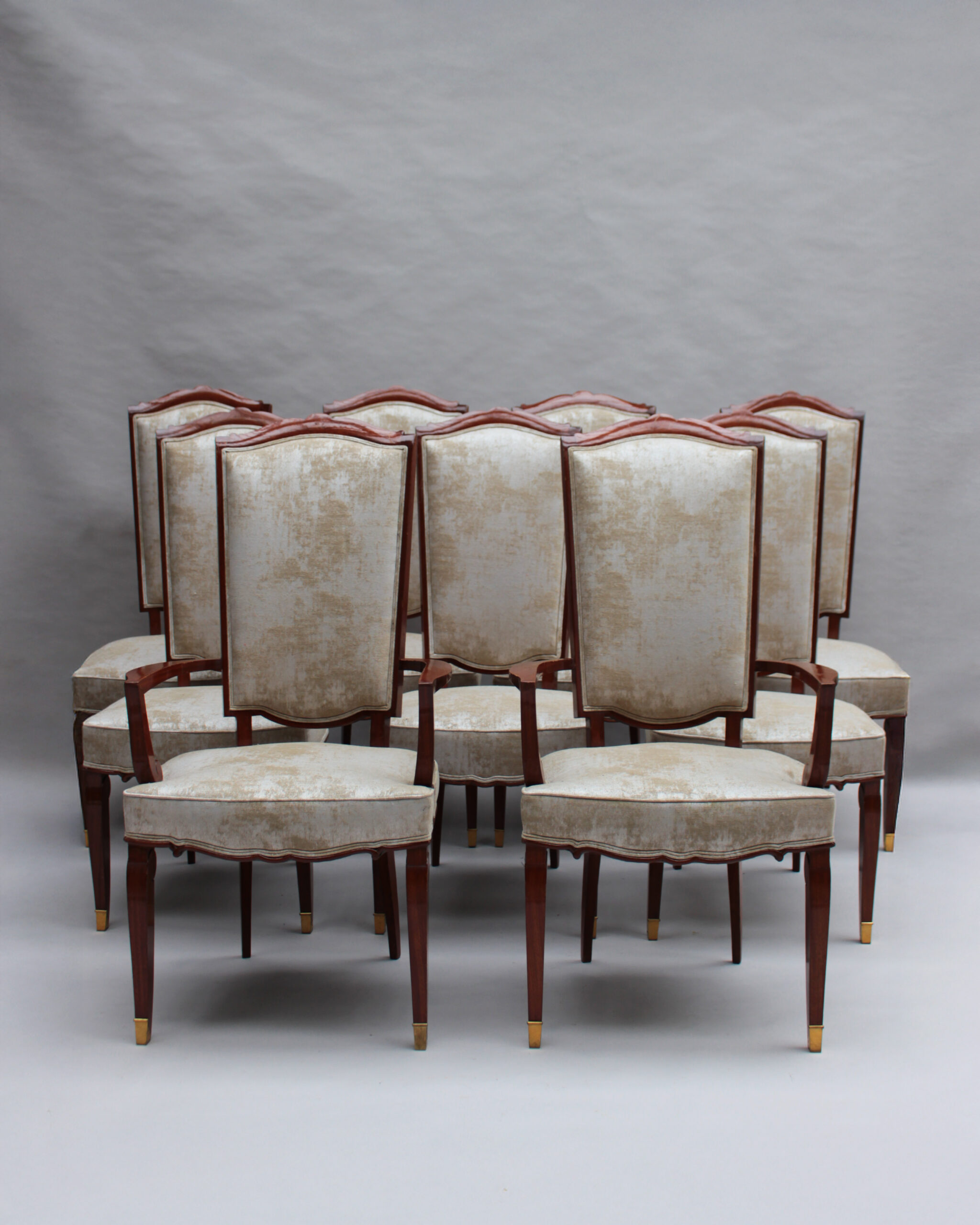 A set of ten fine French Art Deco dining chairs (eight side and two arm), in mahogany with bronze sabots. Designed by Jules Leleu for the Palais de l’Elysee in 1947 Documentation: Same chairs represented in the book “Leleu, decorateurs ensembliers” by Francoise Siriex – Monelle Hayot editor – page 376