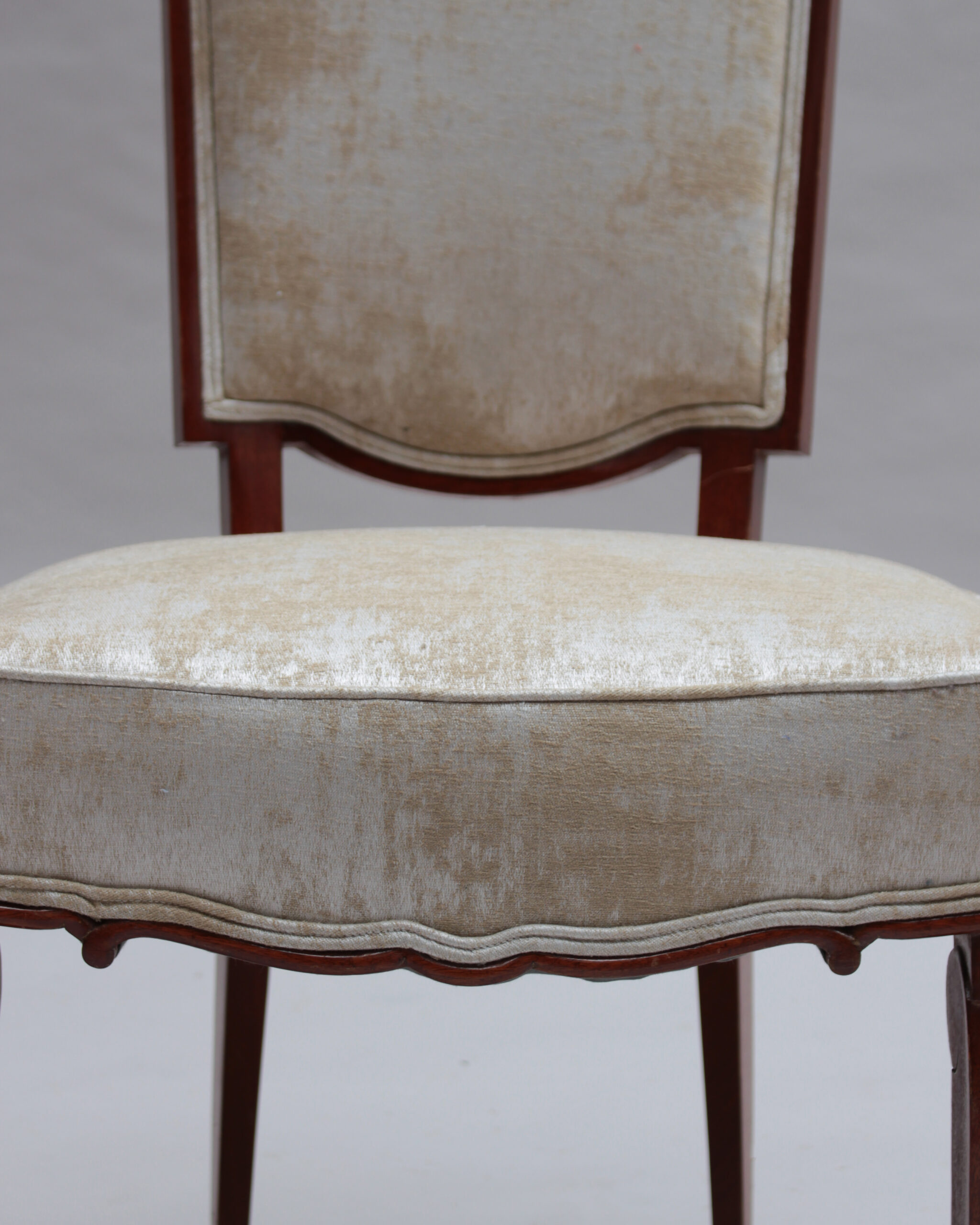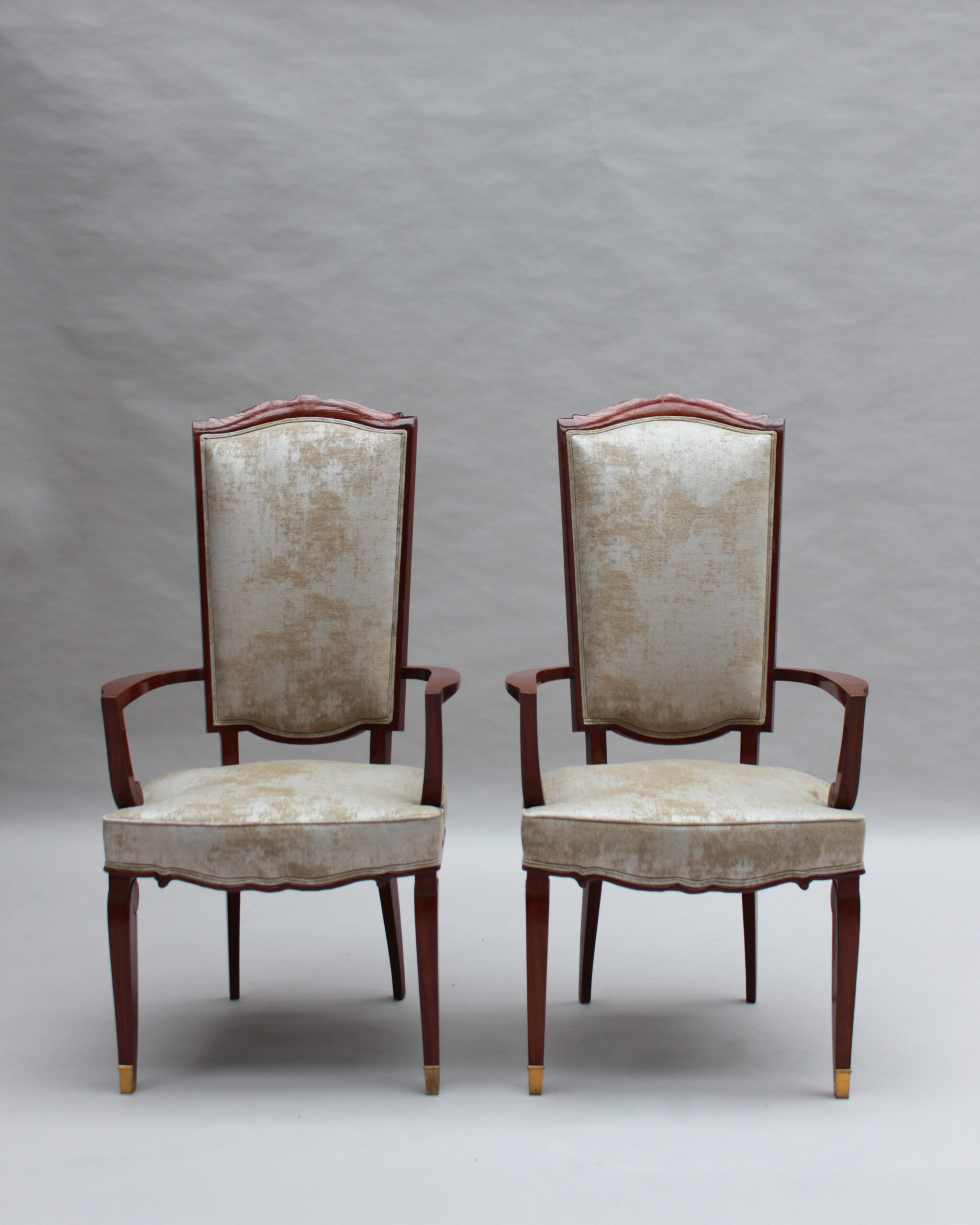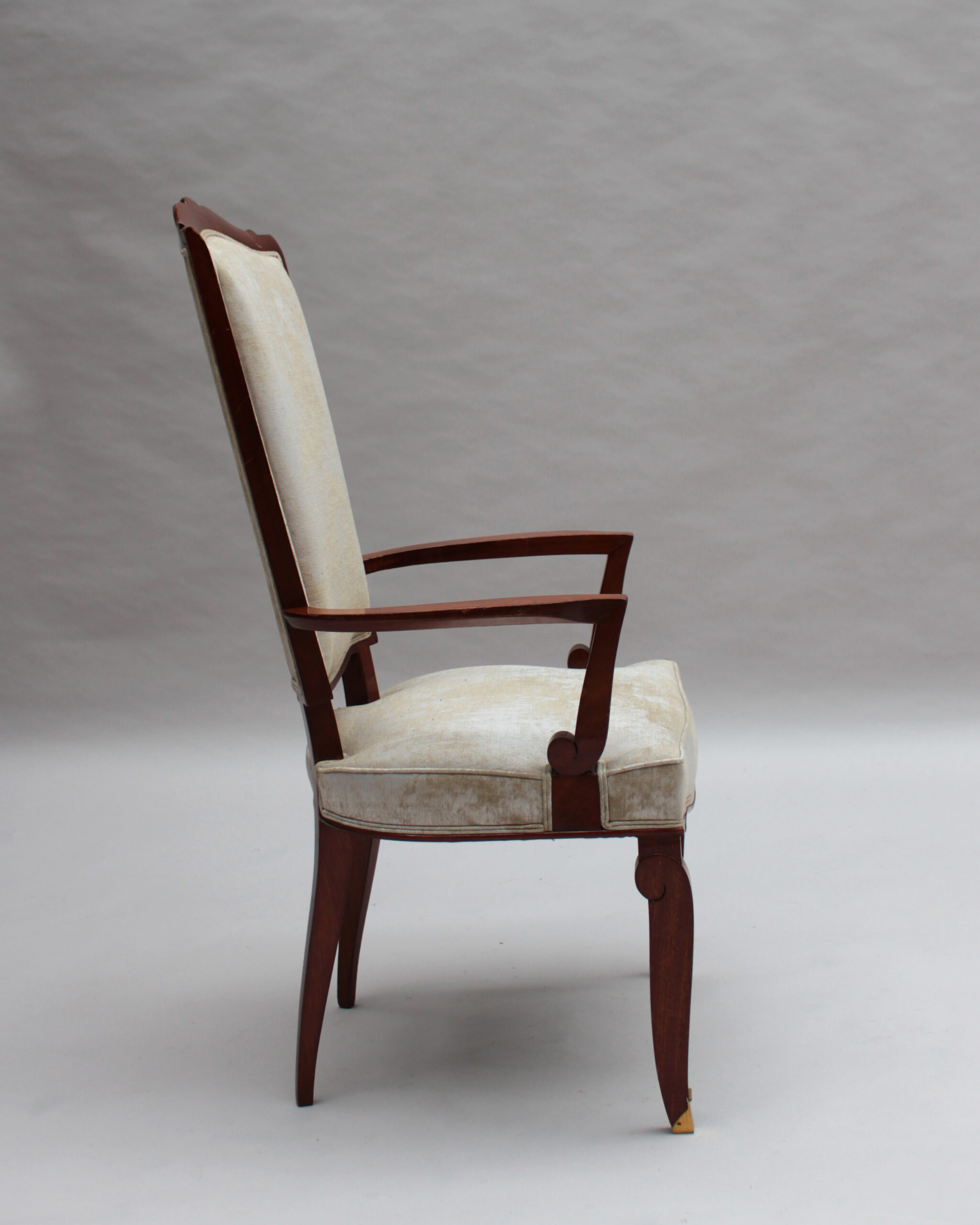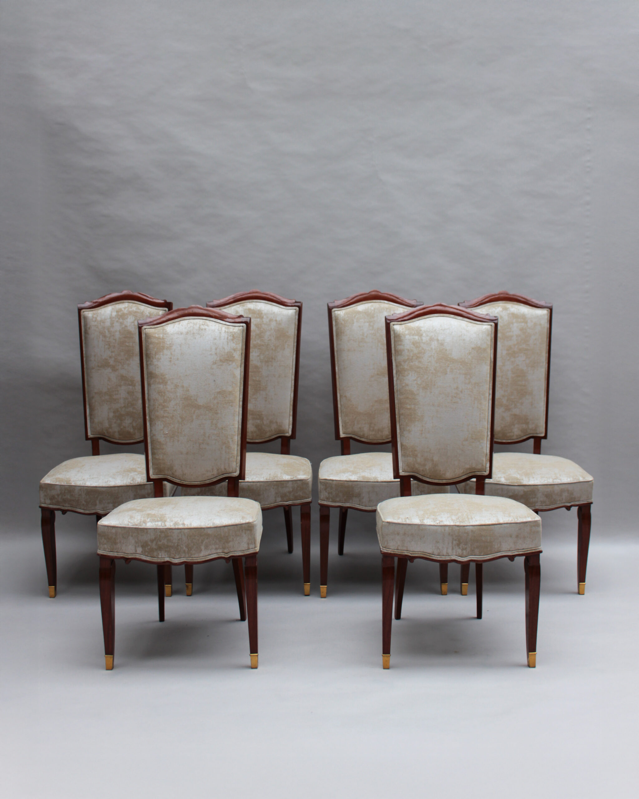 A set of ten fine French Art Deco dining chairs (eight side and two arm), in mahogany with bronze sabots. Designed by Jules Leleu for the Palais de l’Elysee in 1947 Documentation: Same chairs represented in the book “Leleu, decorateurs ensembliers” by Francoise Siriex – Monelle Hayot editor – page 376
