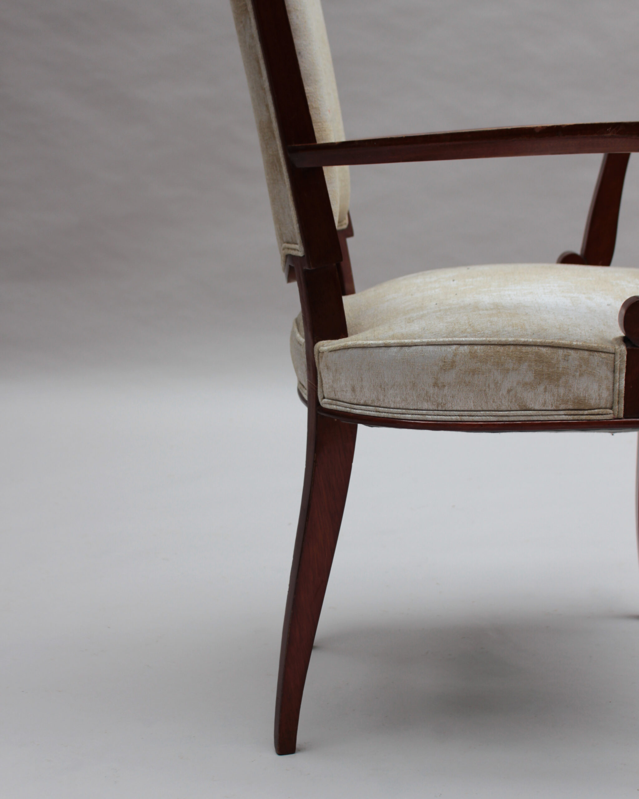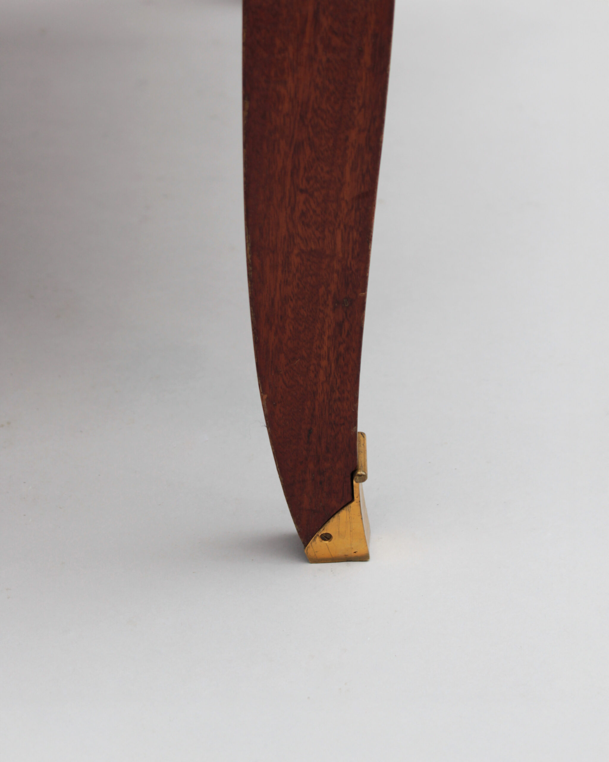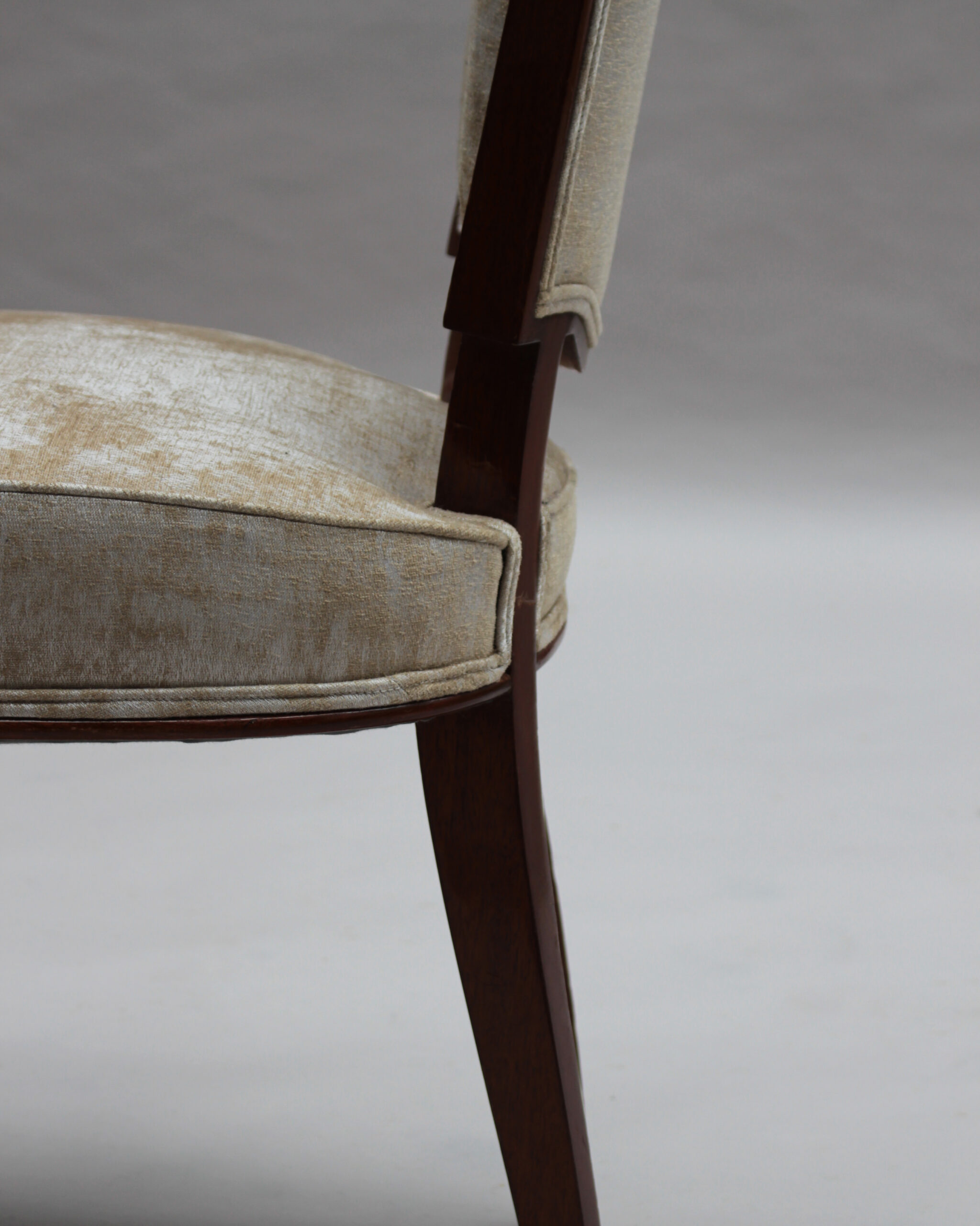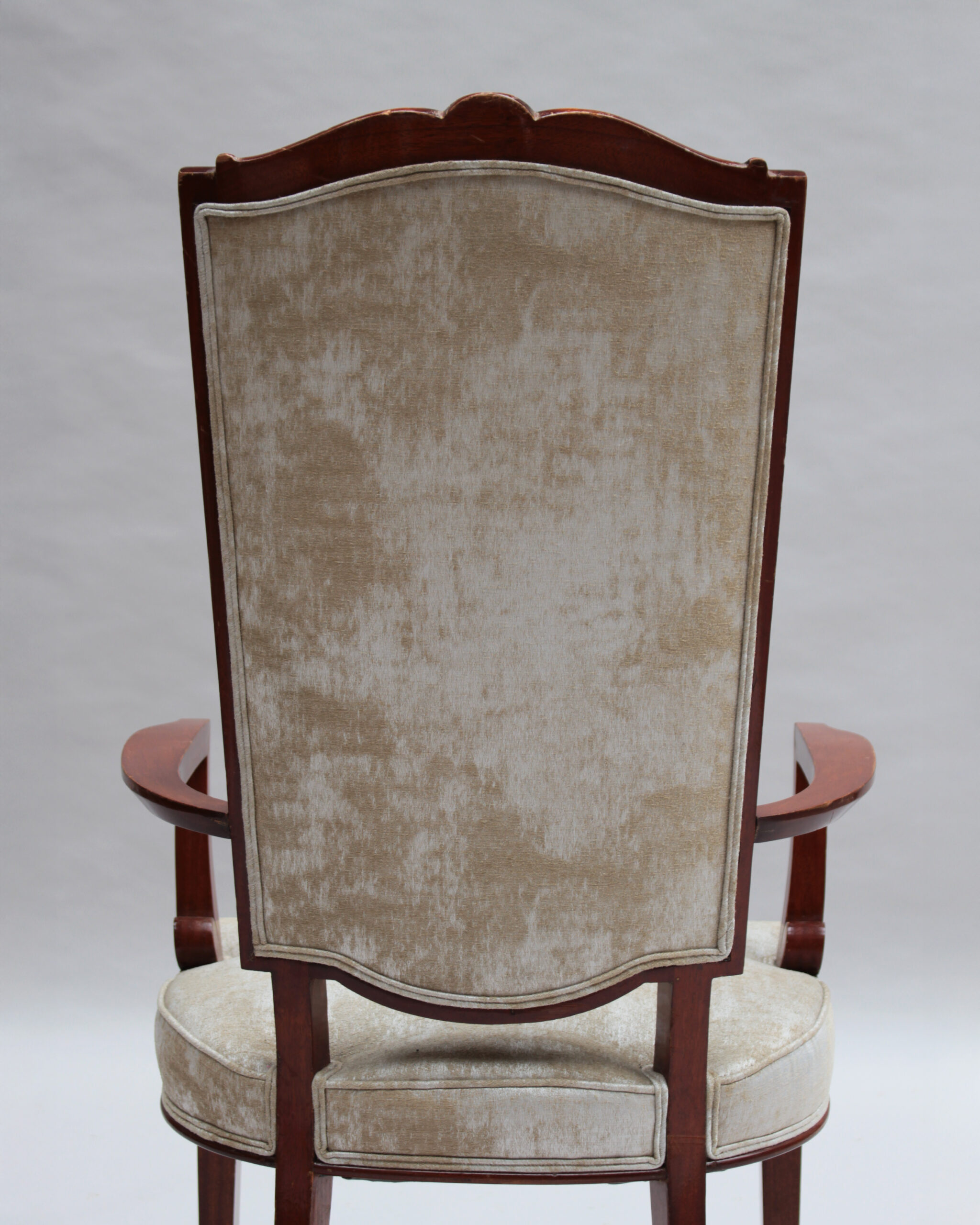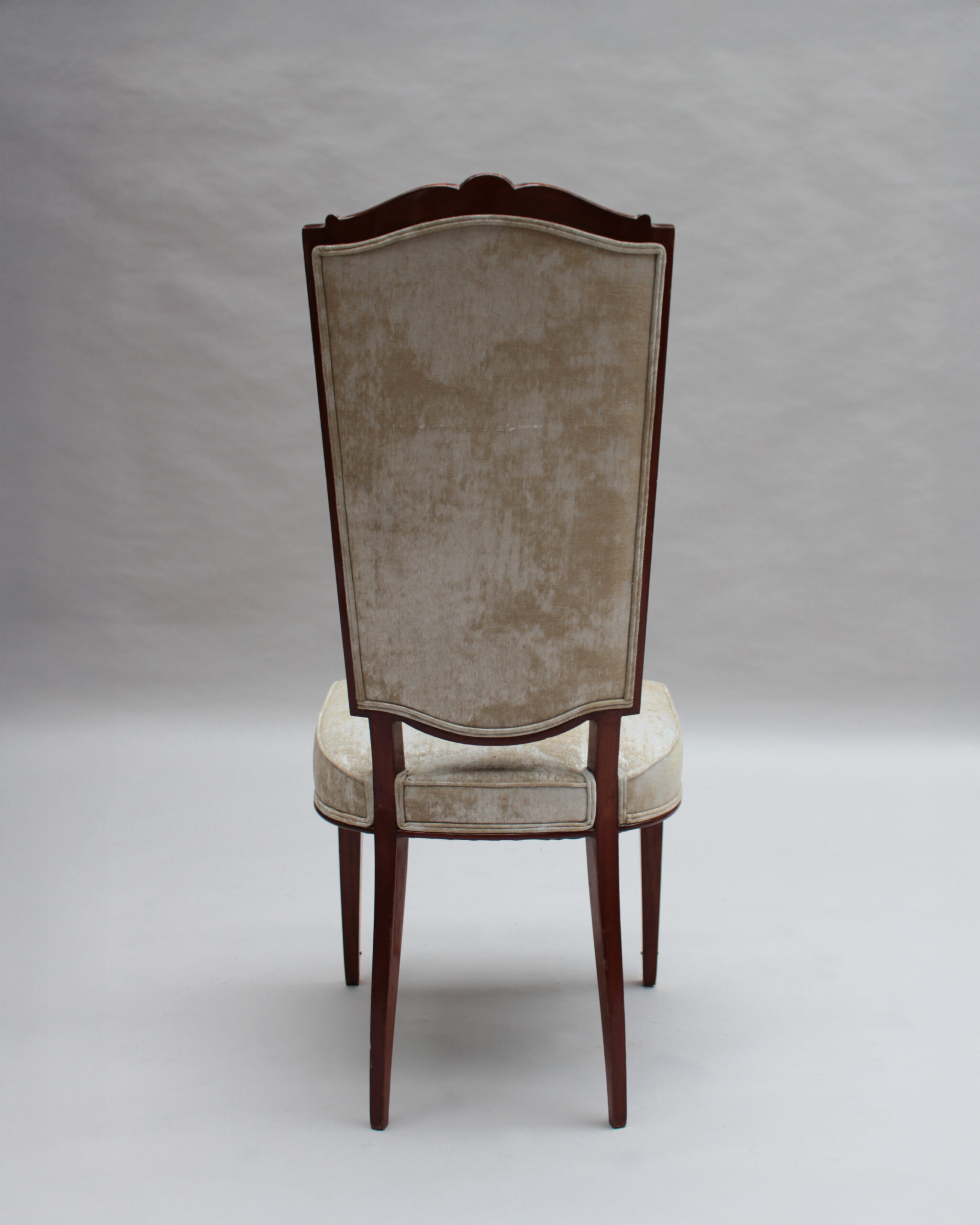 A set of ten fine French Art Deco dining chairs (eight side and two arm), in mahogany with bronze sabots. Designed by Jules Leleu for the Palais de l’Elysee in 1947 Documentation: Same chairs represented in the book “Leleu, decorateurs ensembliers” by Francoise Siriex – Monelle Hayot editor – page 376