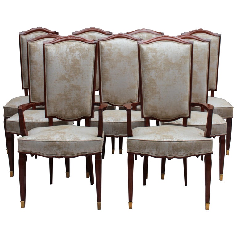 Set of 10 Fine French Art Deco Mahogany Chairs by Jules Leleu (8 Side and 2 Arm)