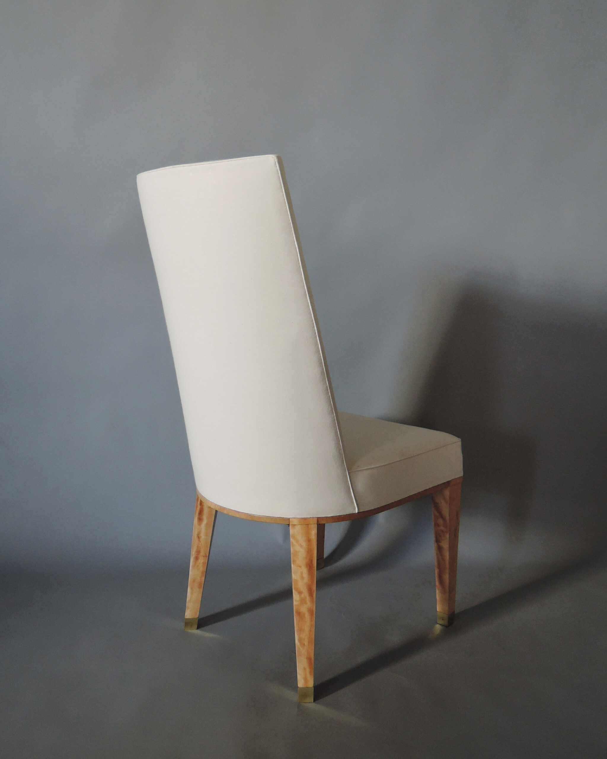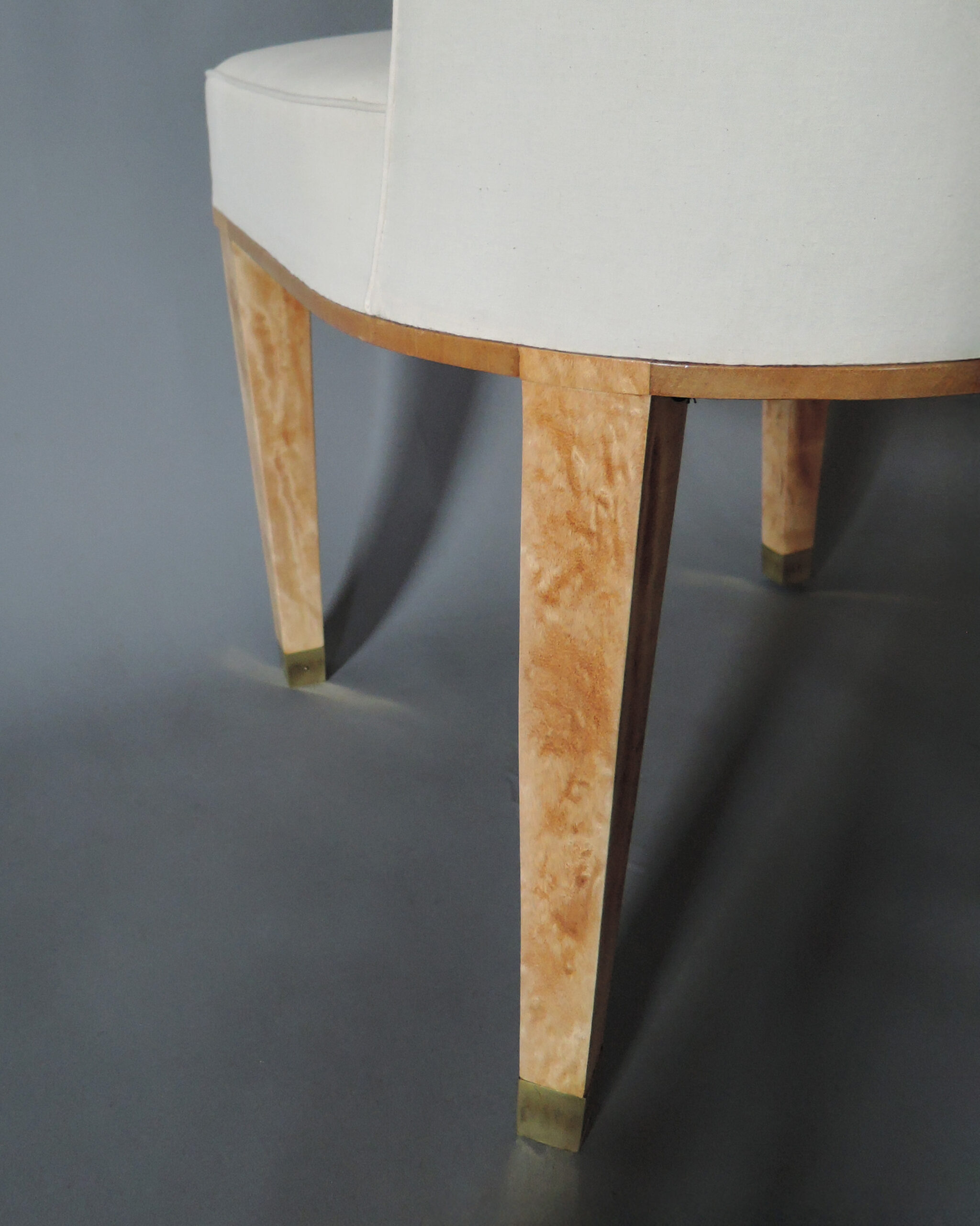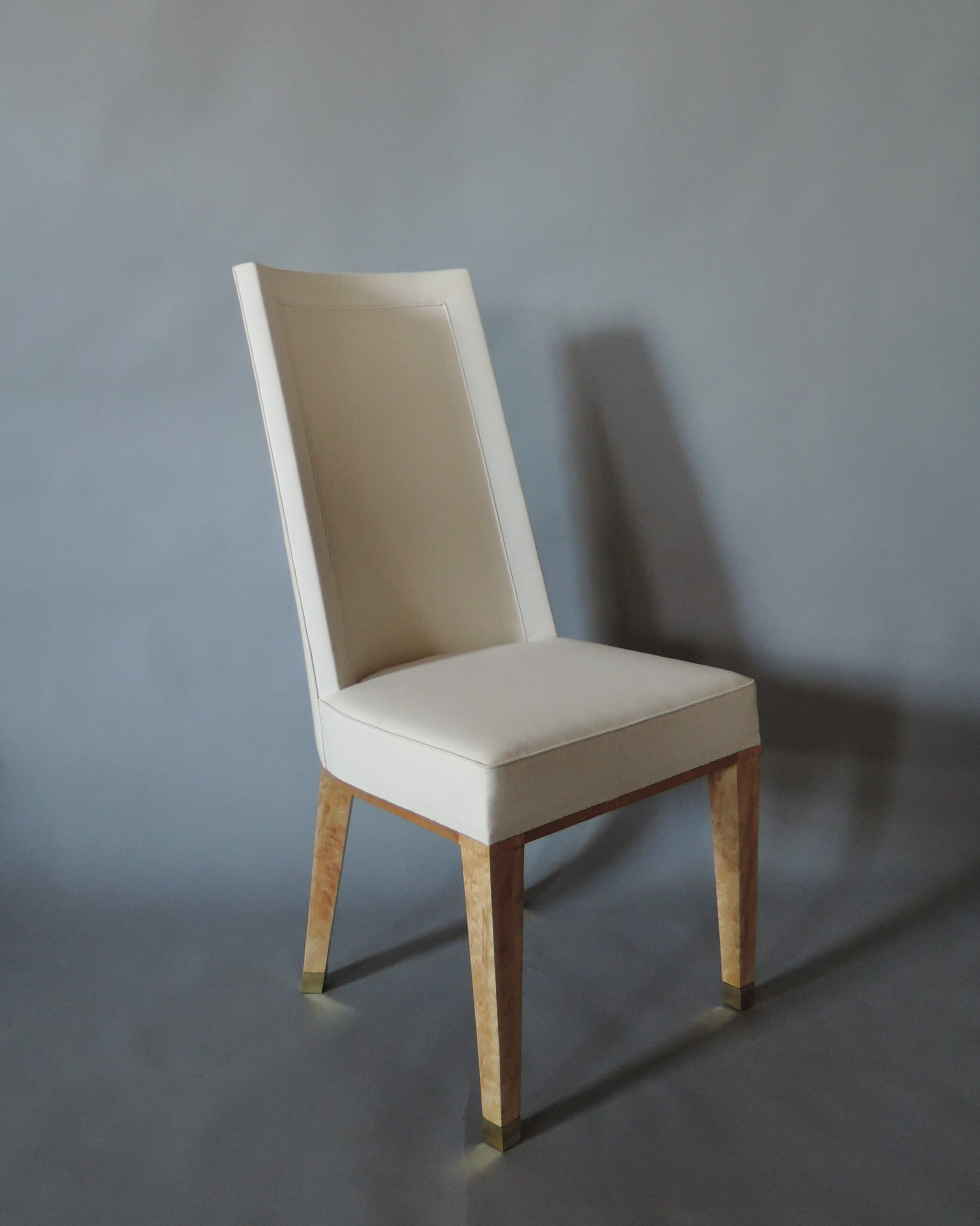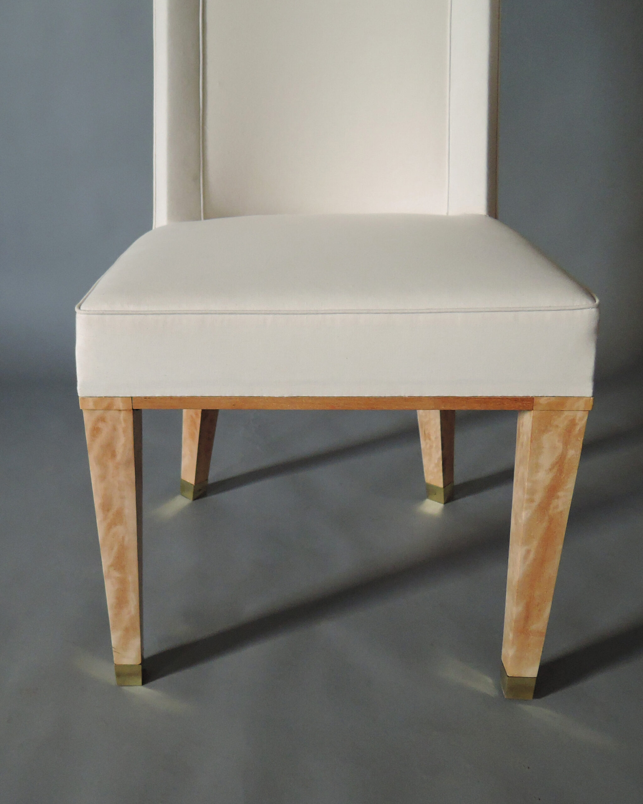 Jacques Adnet (1900–1984) – Set of eight fine French Mid-Century comfortable bleached mahogany dining chairs with brass sabots. Provenance: Palais des Consuls of Rouen. Bibliography: « Jacques Adnet » by Alain-Rene Hardy and Gaelle Millet – Les Editions de l’Amateur – Page 145 Mobilier et Decoration, March 1958