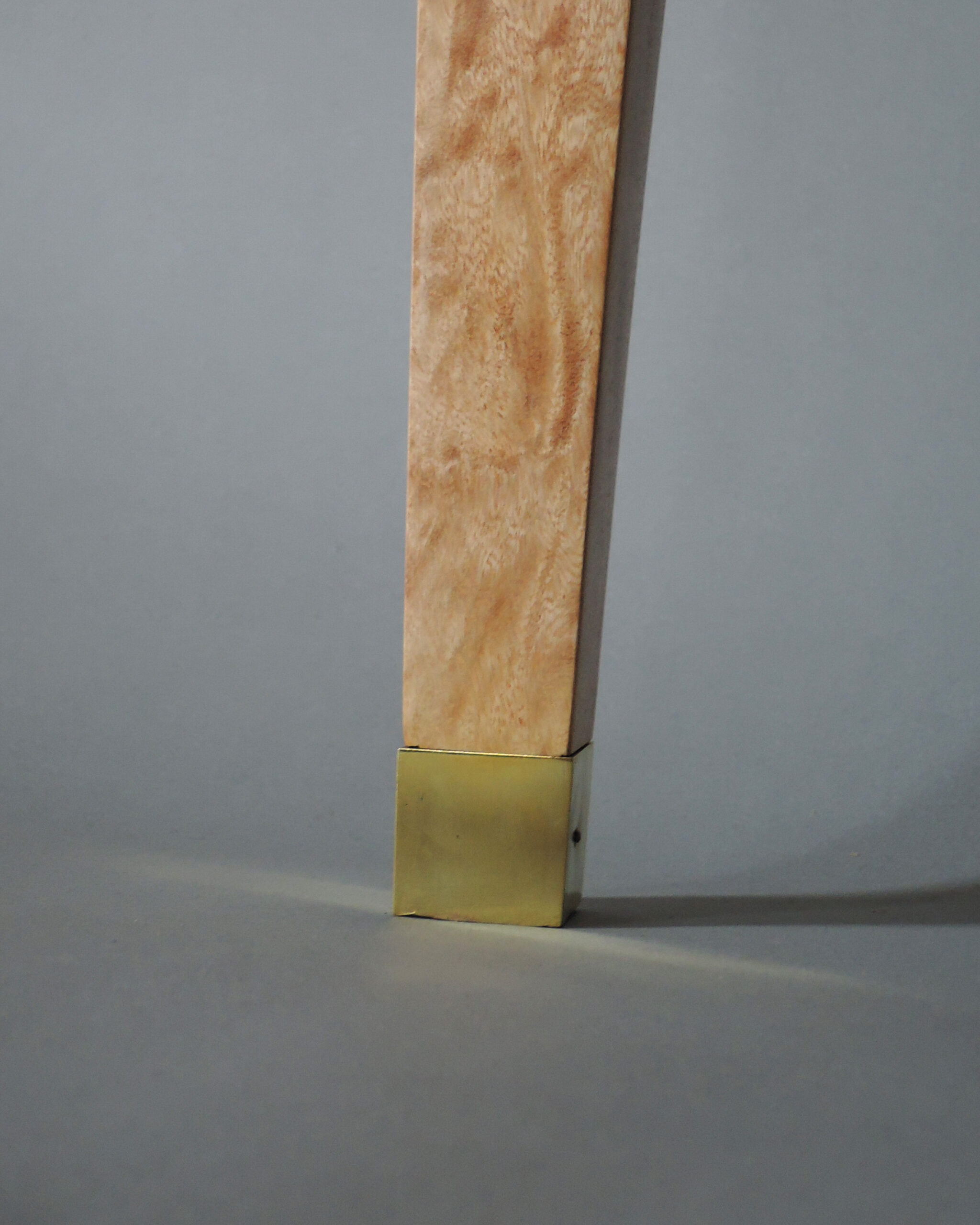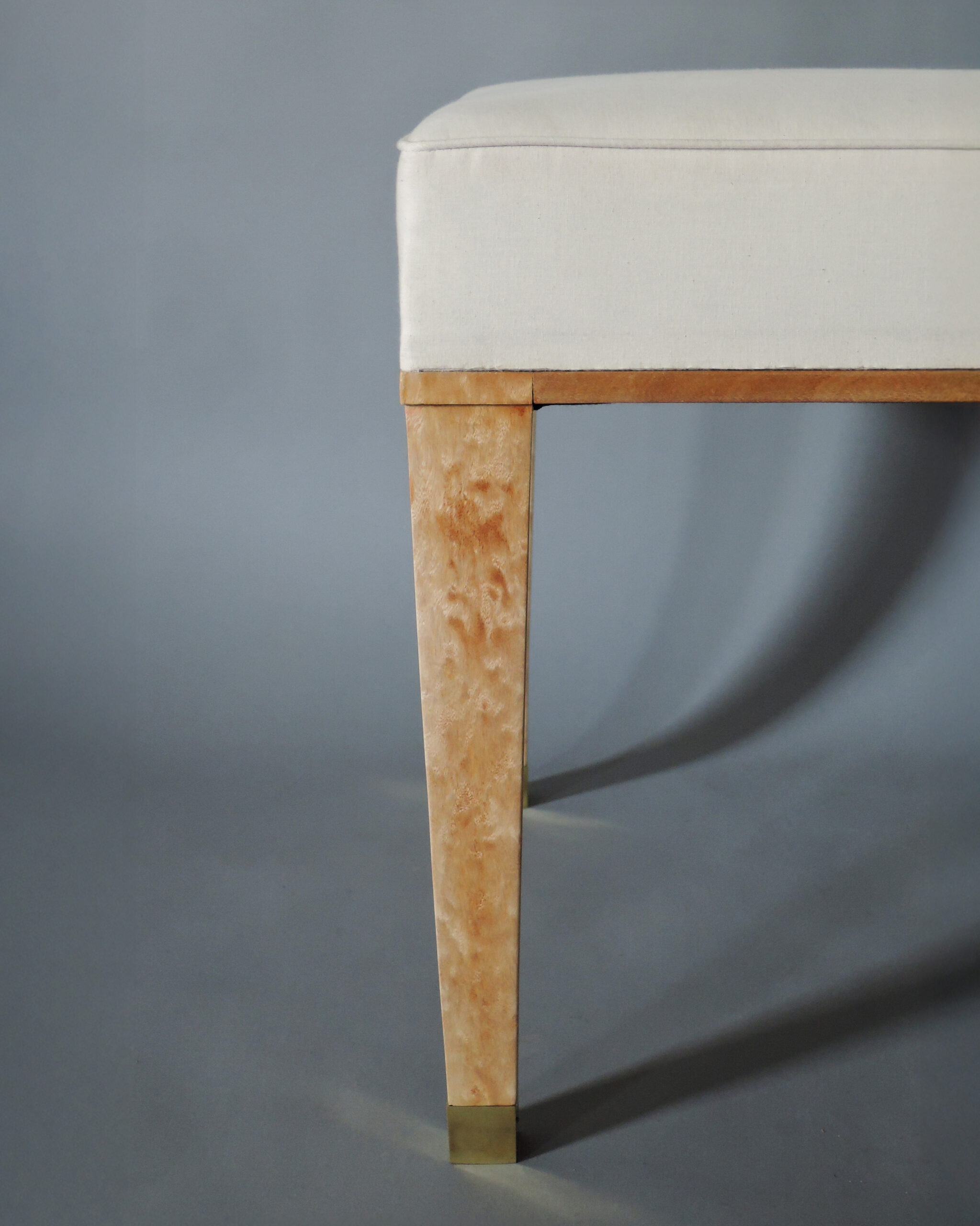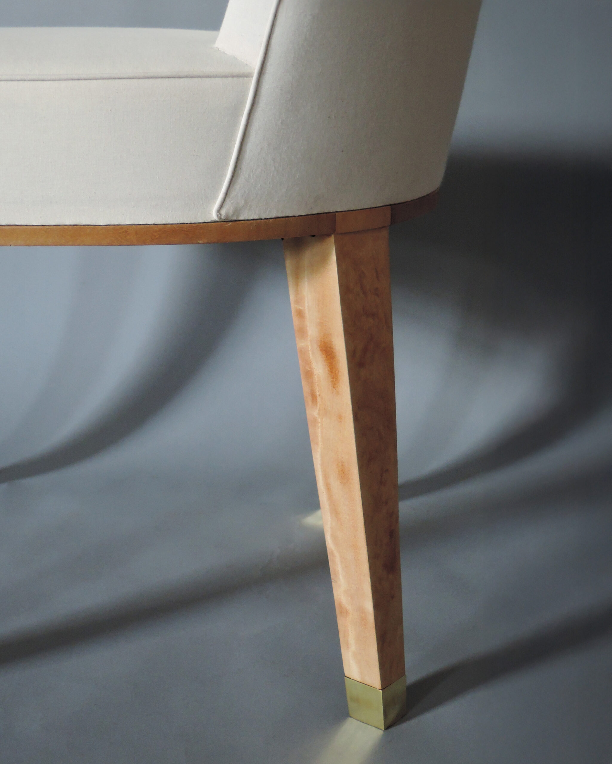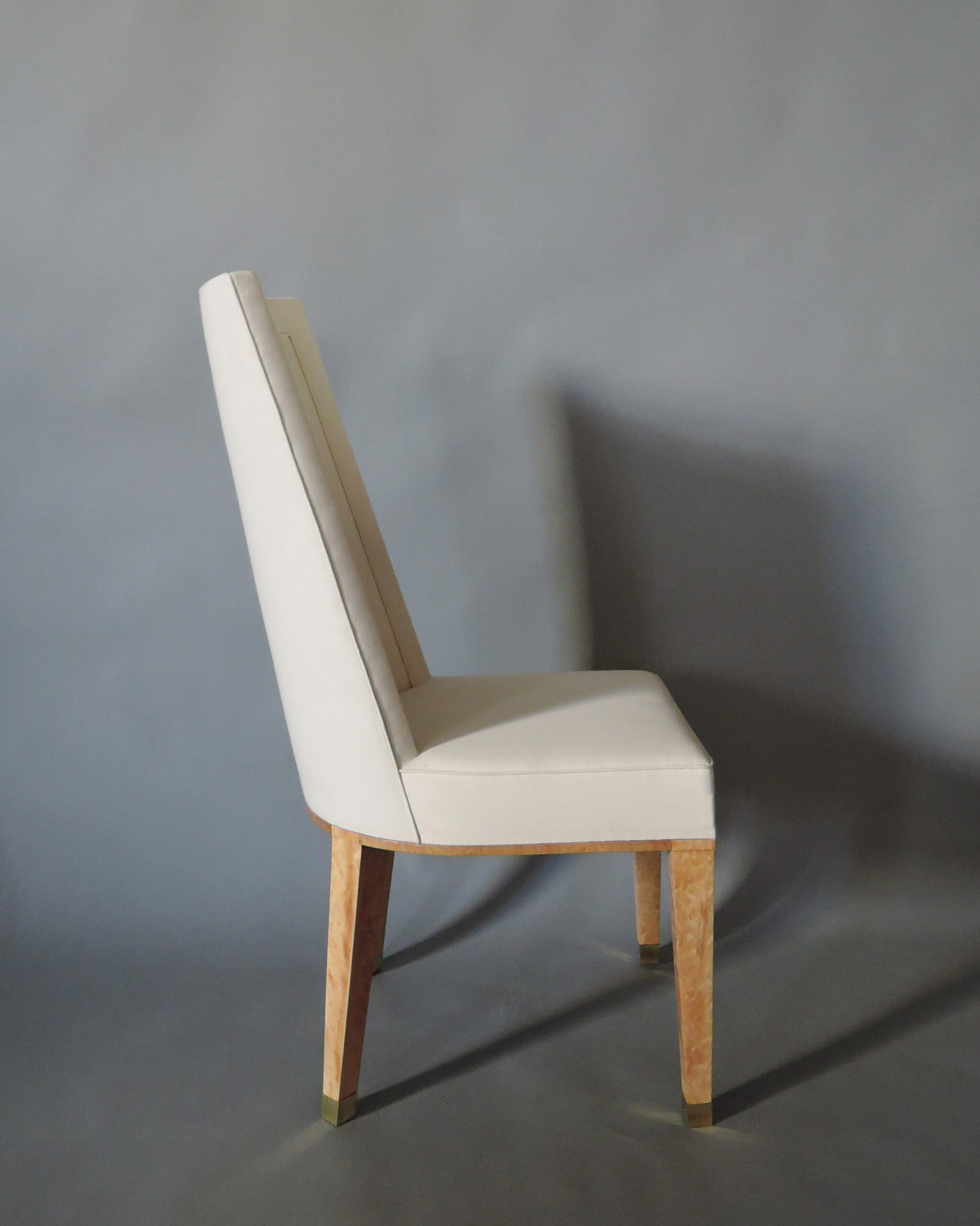 Jacques Adnet (1900–1984) – Set of eight fine French Mid-Century comfortable bleached mahogany dining chairs with brass sabots. Provenance: Palais des Consuls of Rouen. Bibliography: « Jacques Adnet » by Alain-Rene Hardy and Gaelle Millet – Les Editions de l’Amateur – Page 145 Mobilier et Decoration, March 1958