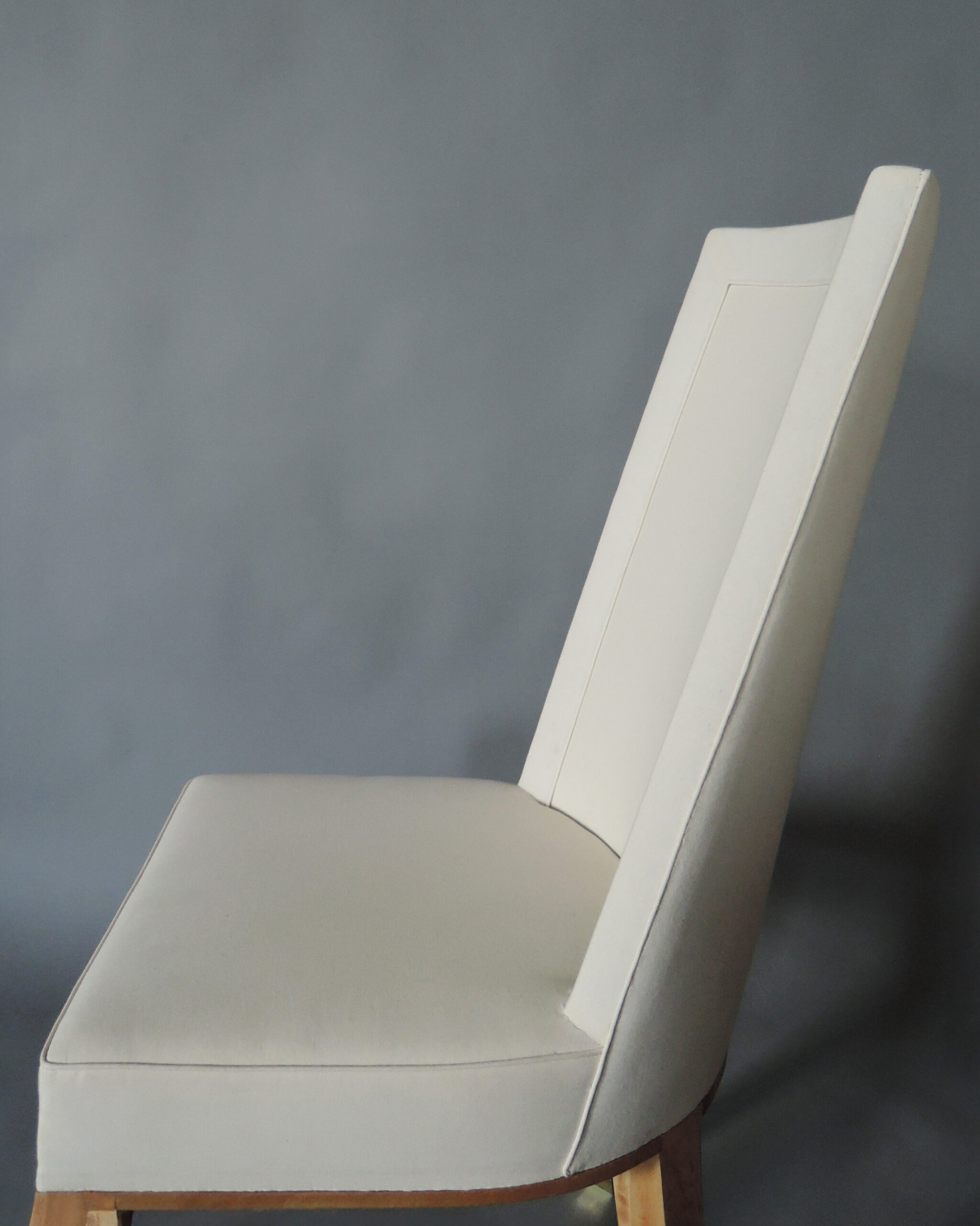 The chairs have been fully refinished. Price does not include re-upholstery (one of the chairs has been re-upholstered as a sample, for approval). Minor wear consistent with age and use.